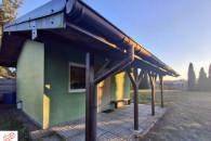 Na działce stoi mały letniskowy domek gdzie można spędzić czas od wiosny po jesień