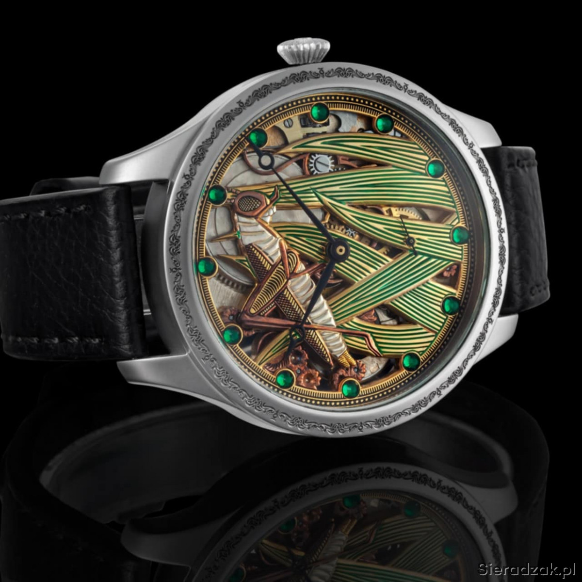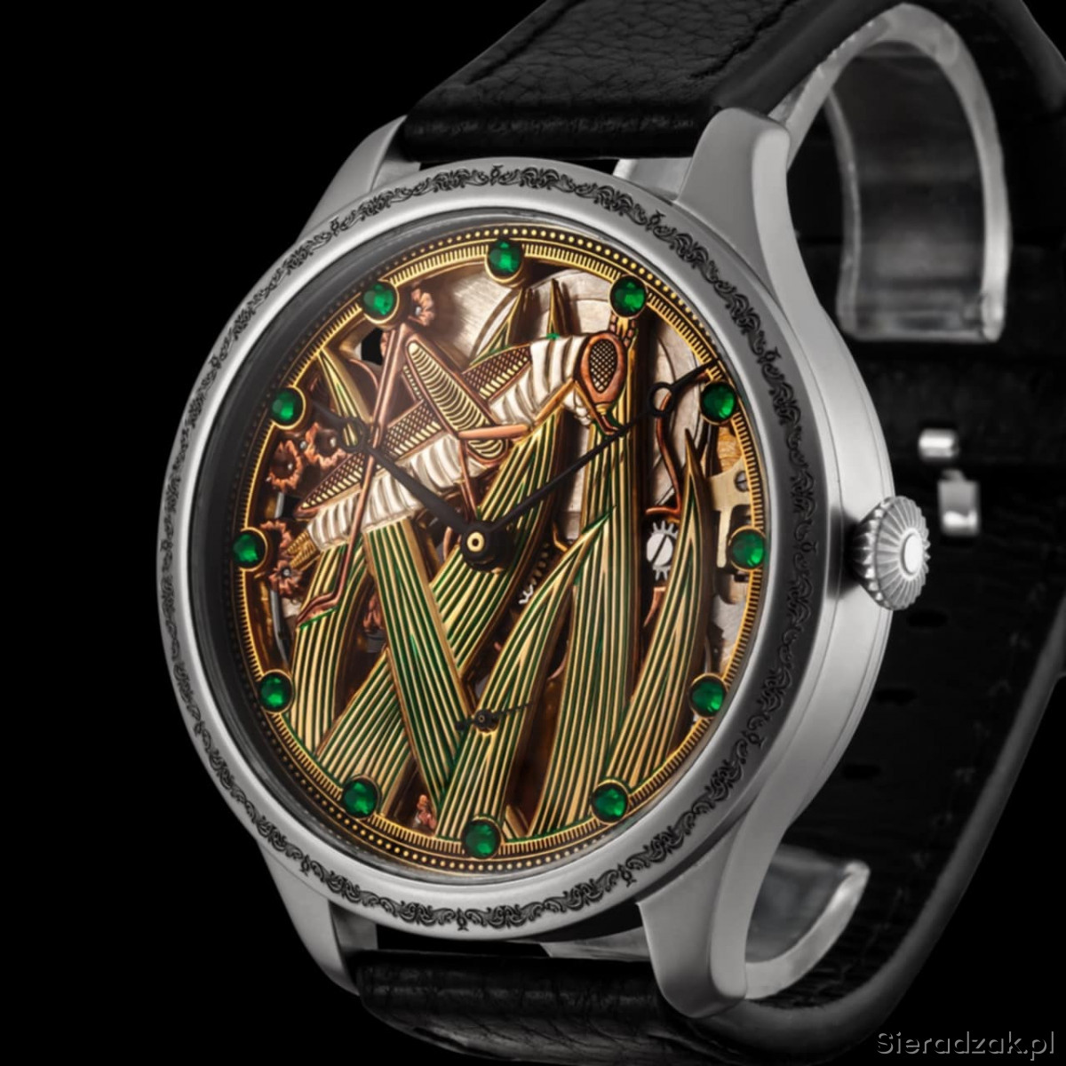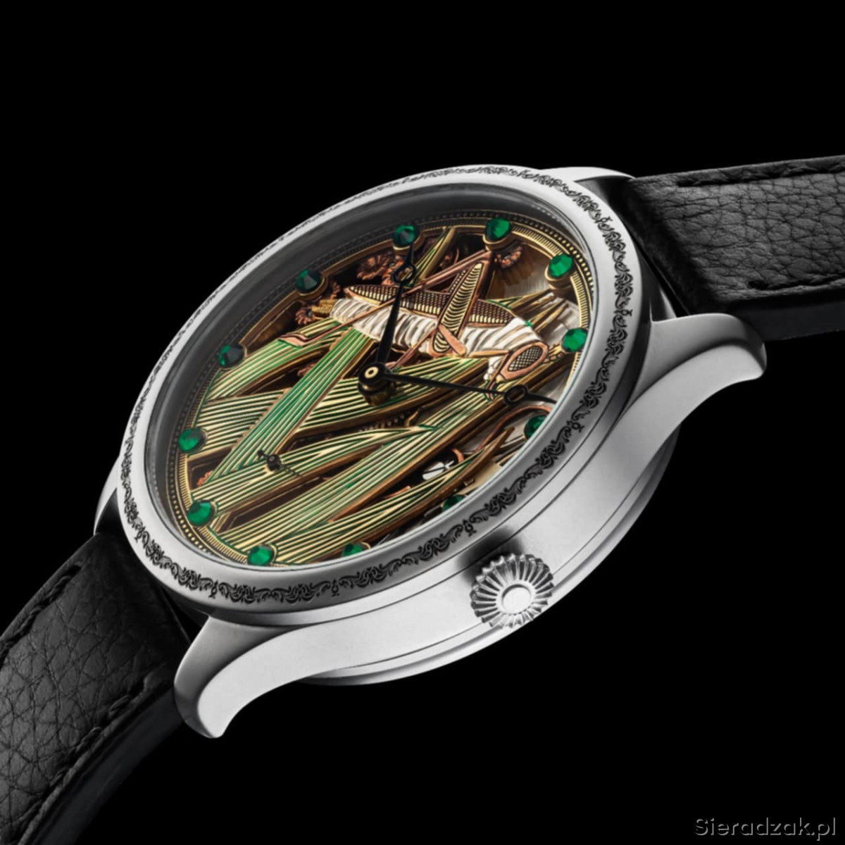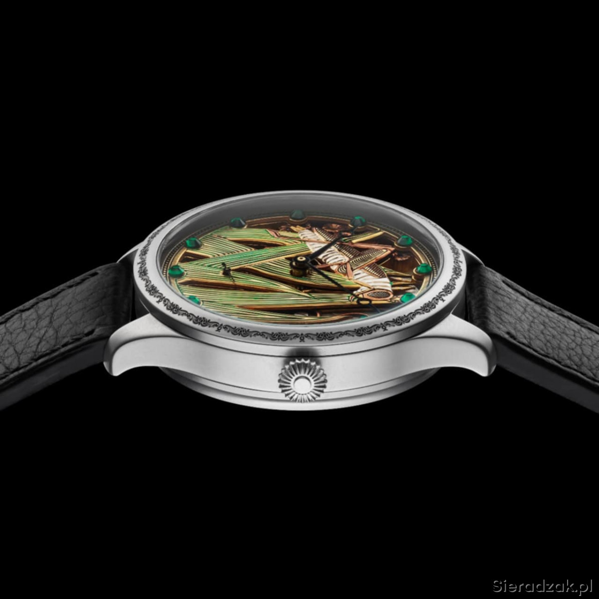Mechanizm nakręcany ręcznie, działa do 26h.
