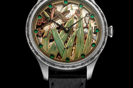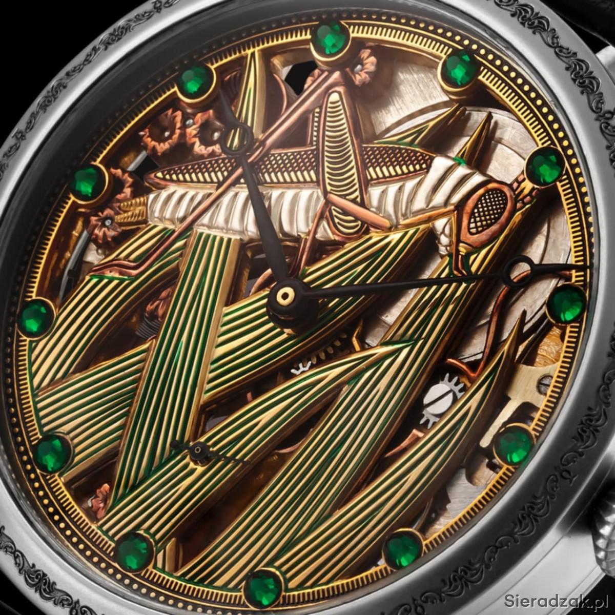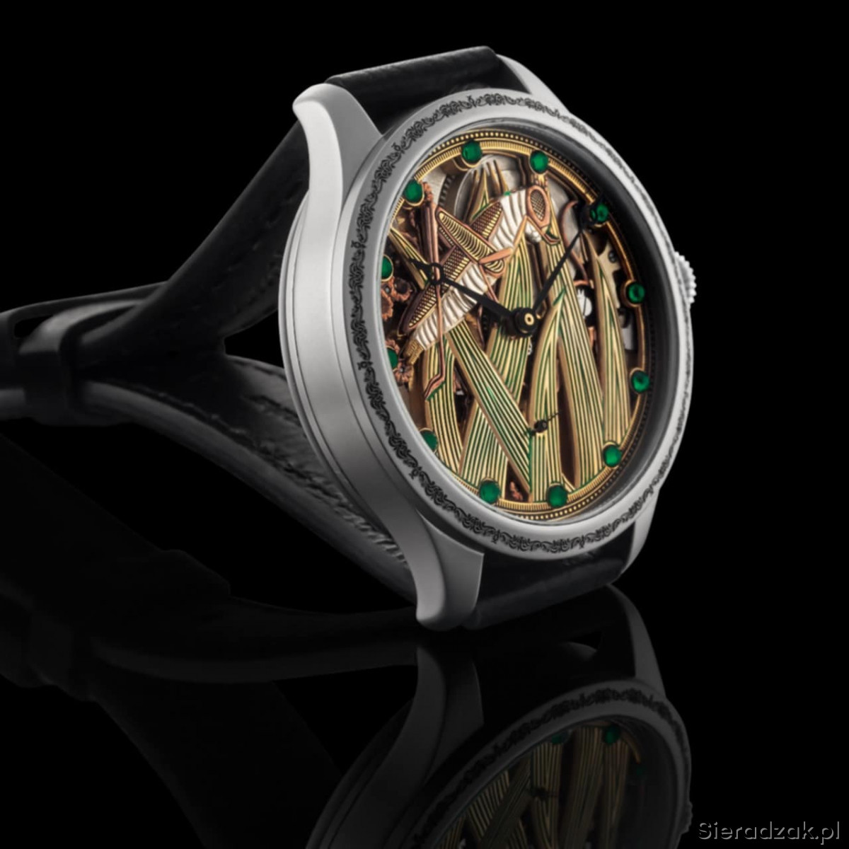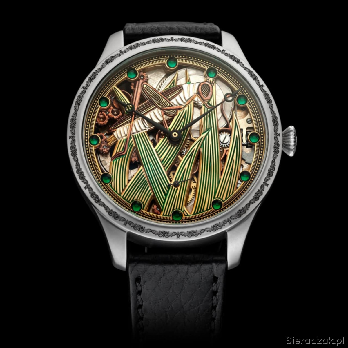 Mechanizm nakręcany ręcznie, działa do 26h.