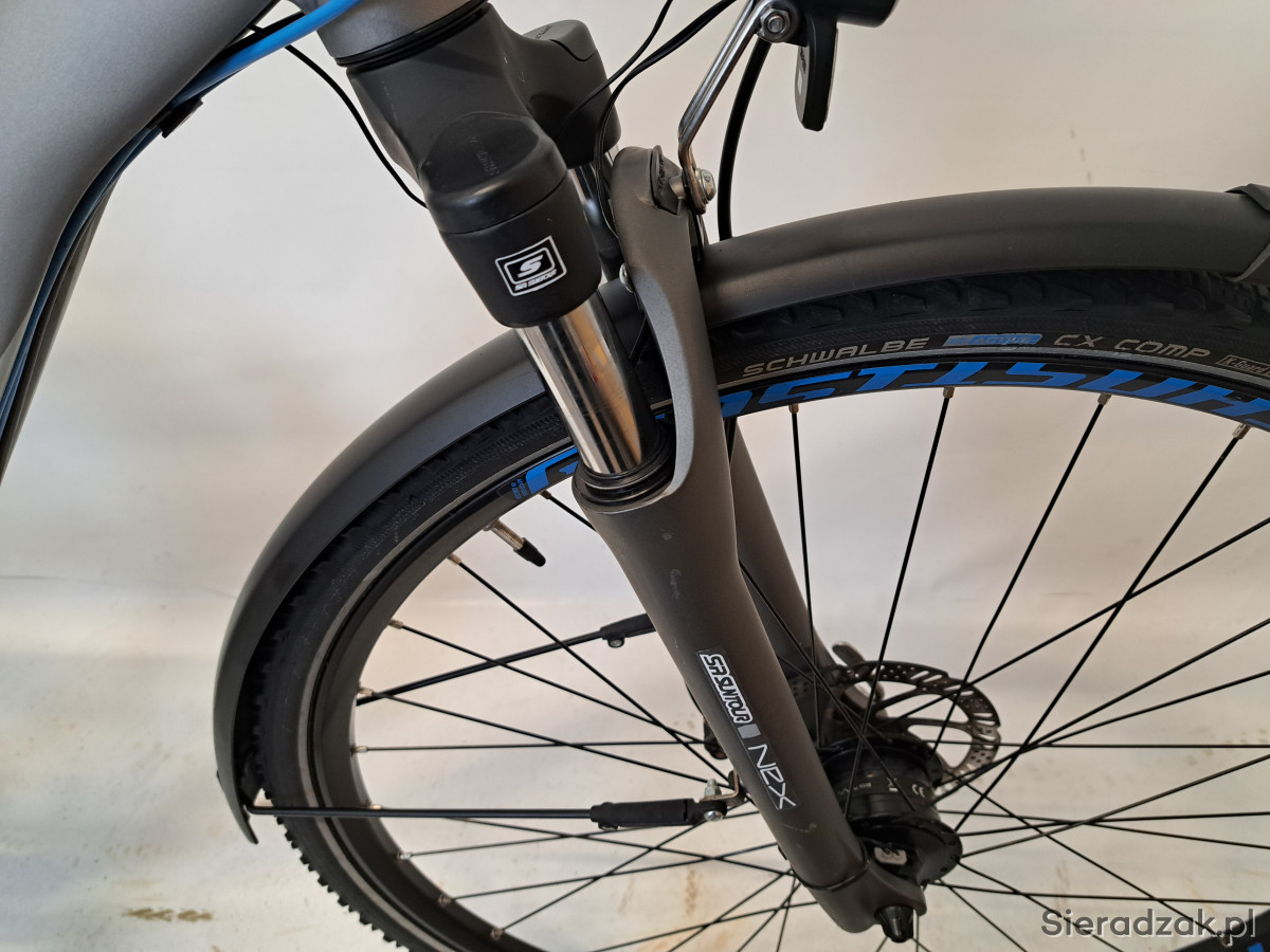 rama aluminium 22" 57cm,napęd 3x9,przerzutki shimano altus,manetki shimano altus,hamulce hydrauliczne tektro,amortyzator sr suntour nex,dynamo shimano w przednim kole,oświetlenie led,opony schwalbe cx comp.stan bardzo dobry.