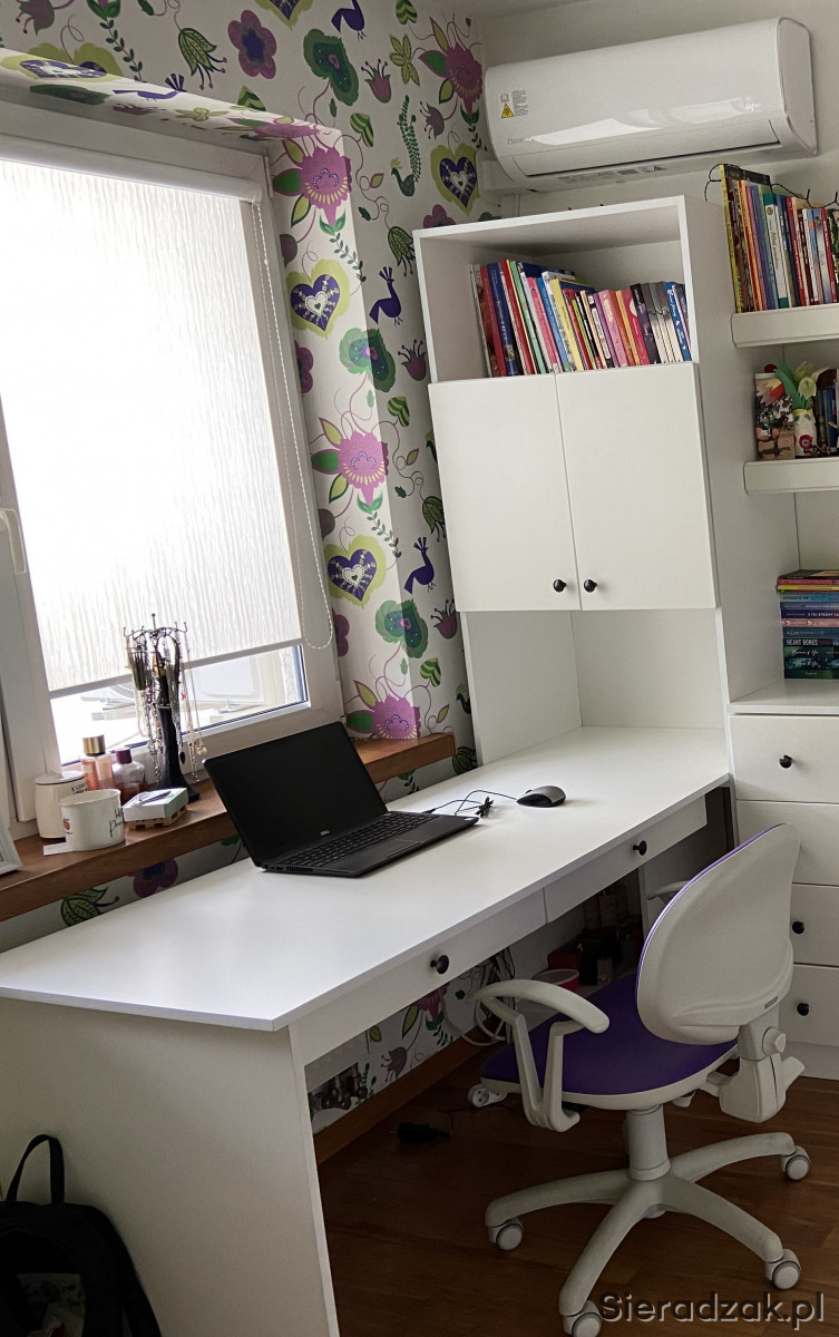 Sprzedam białe biurko młodzieżowe z regałem, Samo biurko ma regulowaną szerokość, a wymiary są poniżej. Pochodzi z zestawu, który wcześniej sprzedawałem. Wszystkie elementy wykonane zostały przez stolarza i są w stanie bardzo dobrym + . Wymiary [WxSxG] :