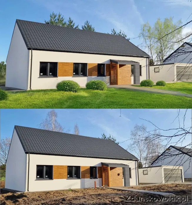 - szerokie zadaszenie nad wejściem z drewnianymi żaluzjami