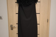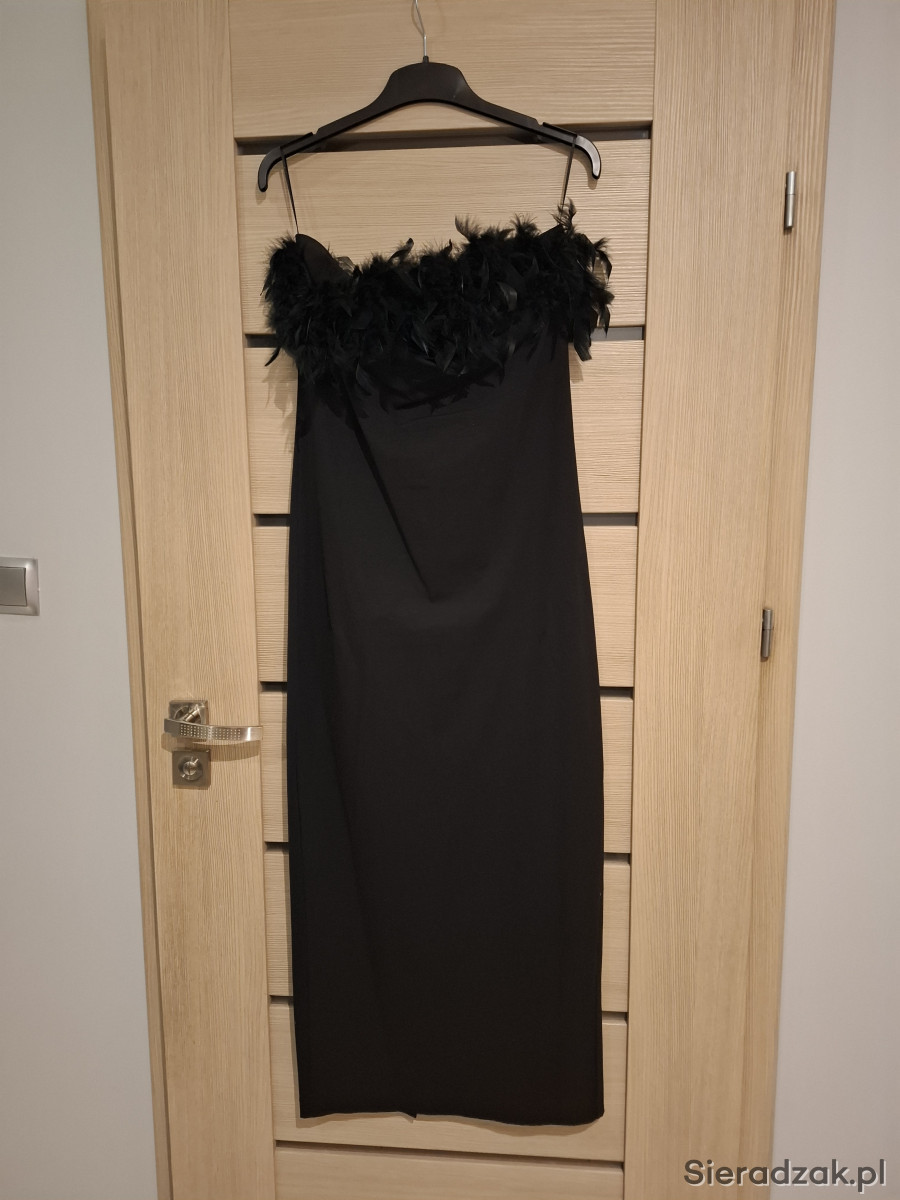Bardzo elegancka sukienka z piorami rozmiar M, założona raz, wymiary biust 88-94, talia 80-84, biodra 94-100, długość 125cm.
