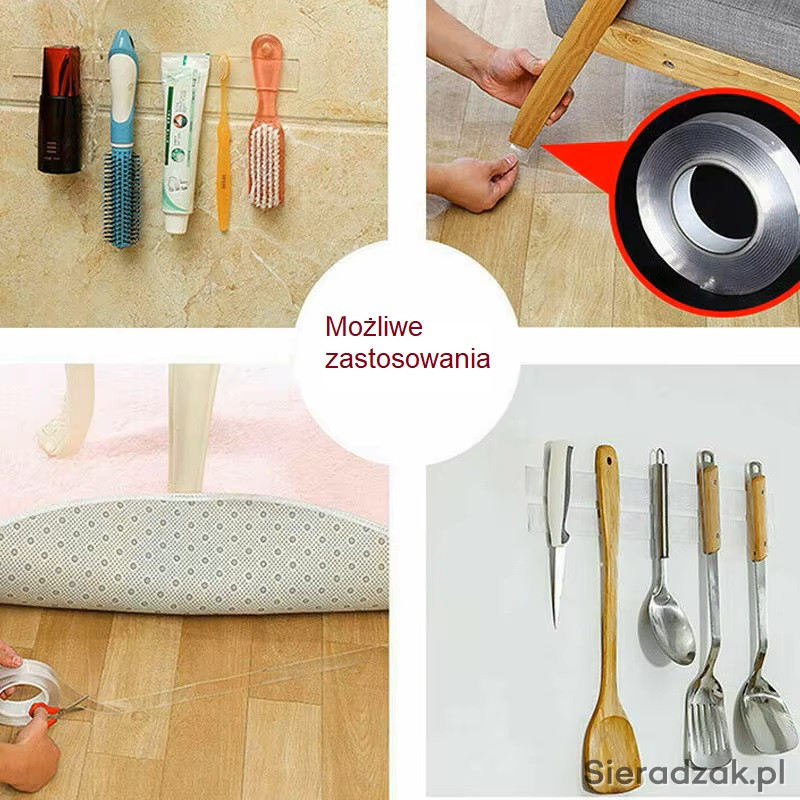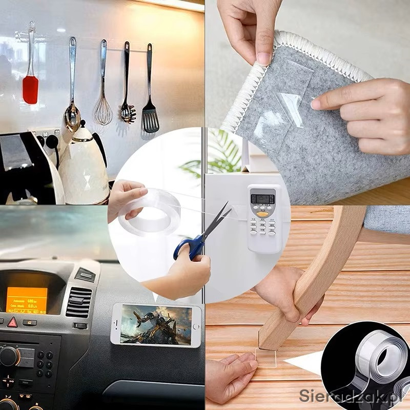 Taśma znajduje szerokie zastosowanie w domu i biurze do przyklejania, mocowania różnych przedmiotów do ścian, podłóg, drzwi, okien itp.