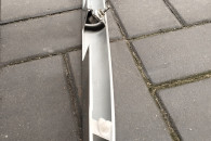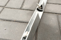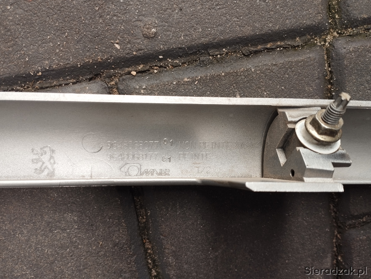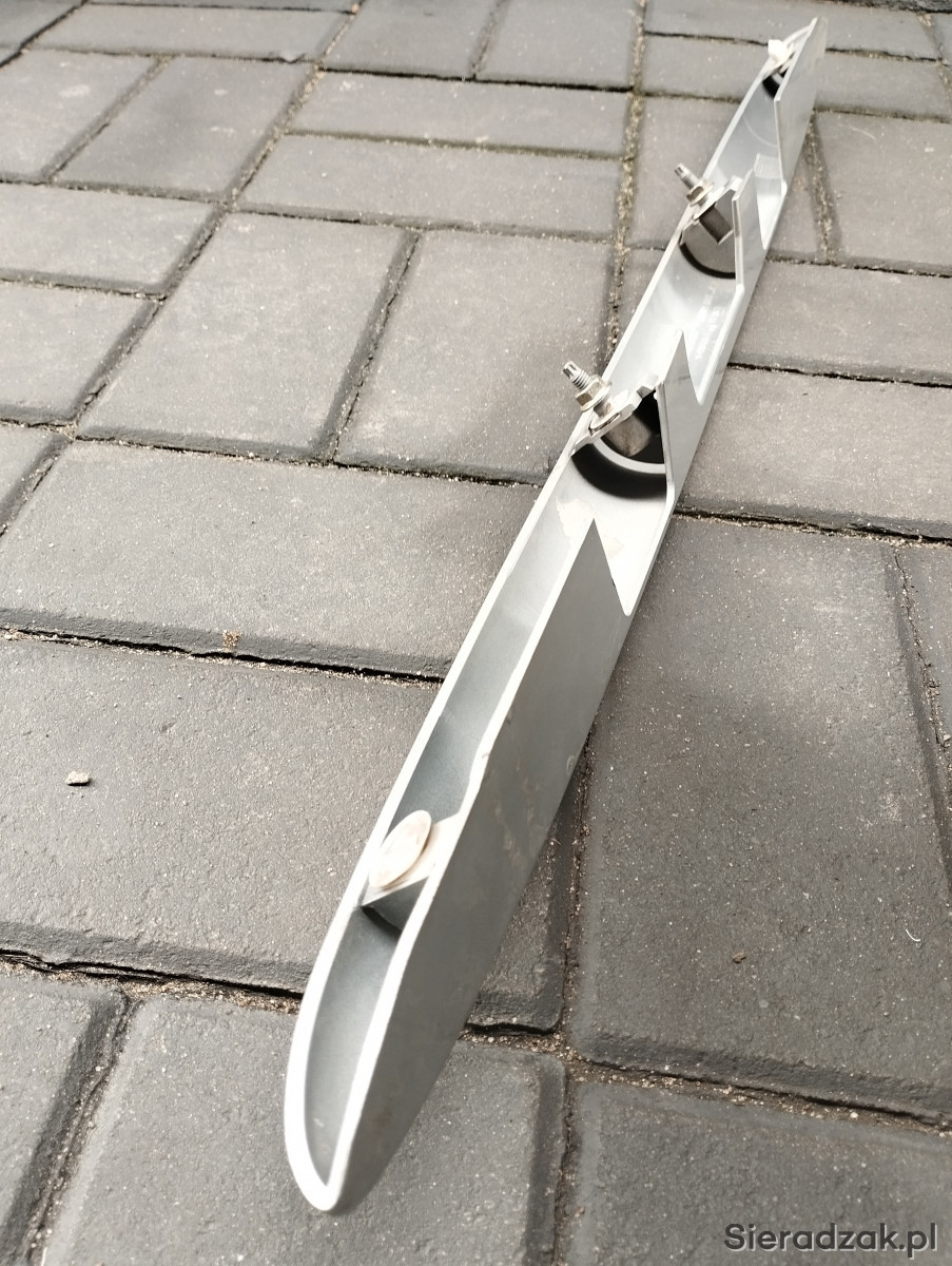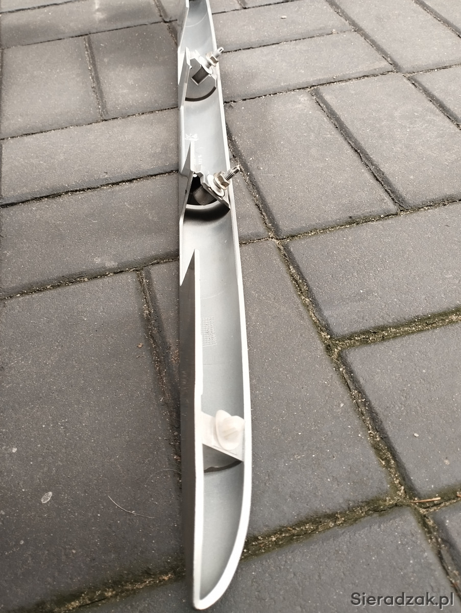 Srebrna listwa tylnej klapy bagażnika do peugota 206. Posiada delikatne rysy i brak jednego zaczepu (pokazane na zdjęciach), ale drugi zaczep i mocowania na śruby wystarczająco trzymają listwę na miejscu.