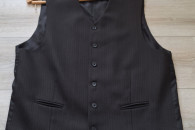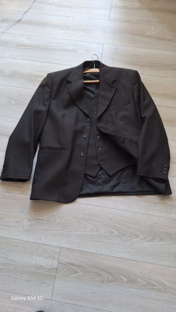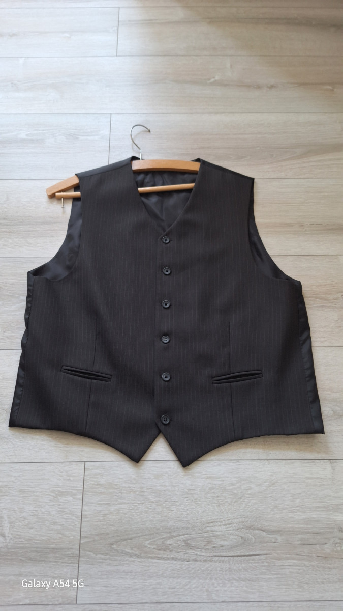 Sprzedam męską marynarkę wraz z kamizelką w rozmiarze 50/170, kolor ciemno-szary w delikatne prążki, po czyszczeniu chemicznym,. Stan bardzo dobry.
