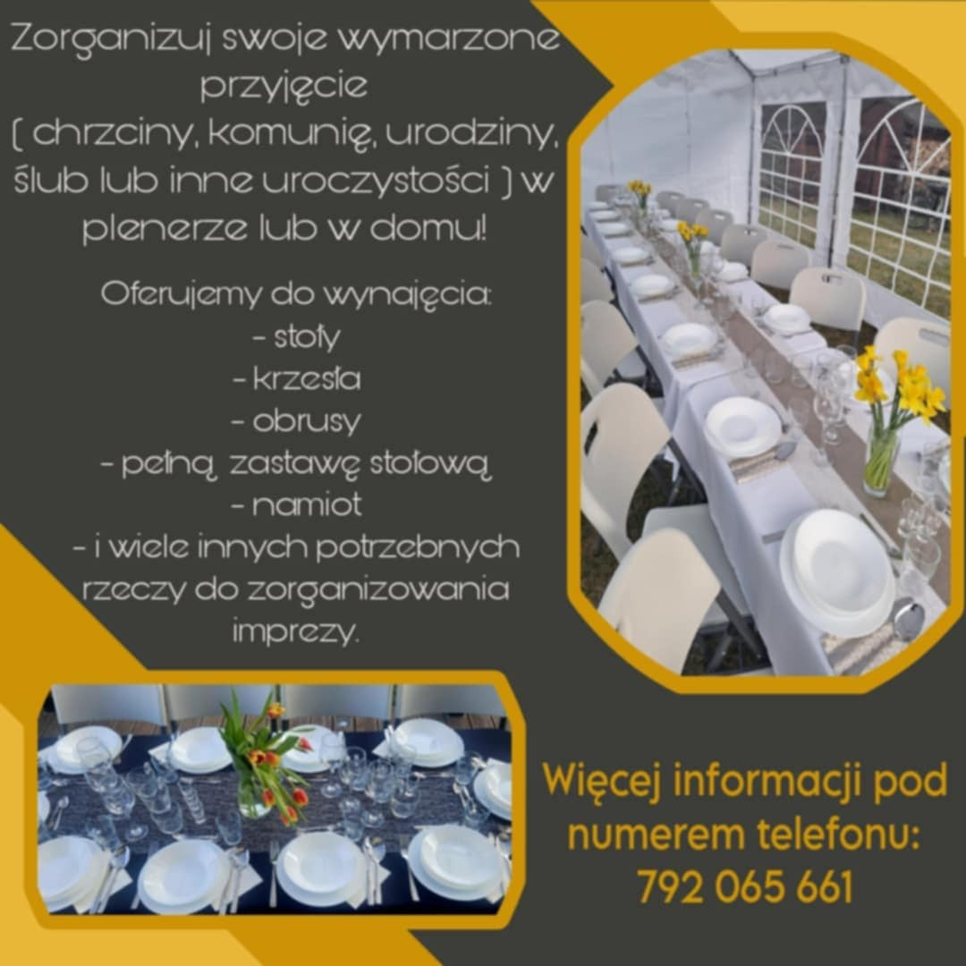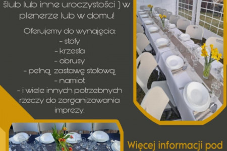 - stoły - krzesła - obrusy - pełną zastawę stołową- namioty - i wiele innych rzeczy potrzebnym do organizacji przyjęcia.