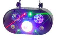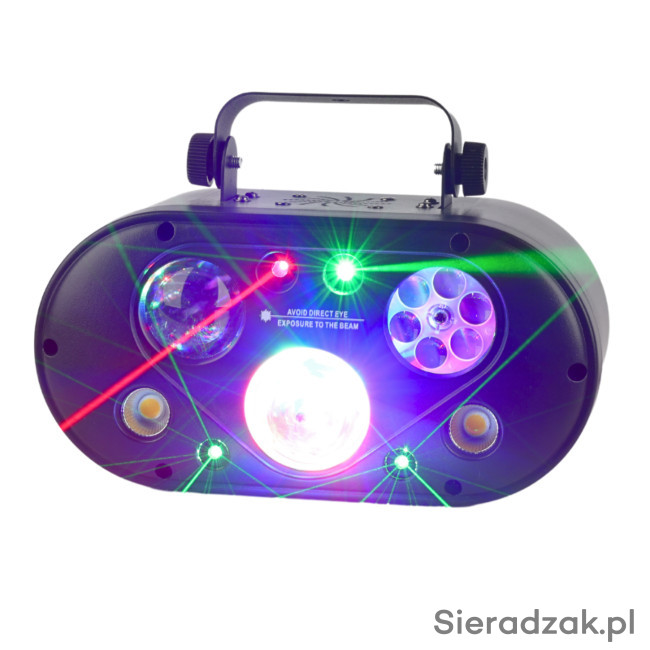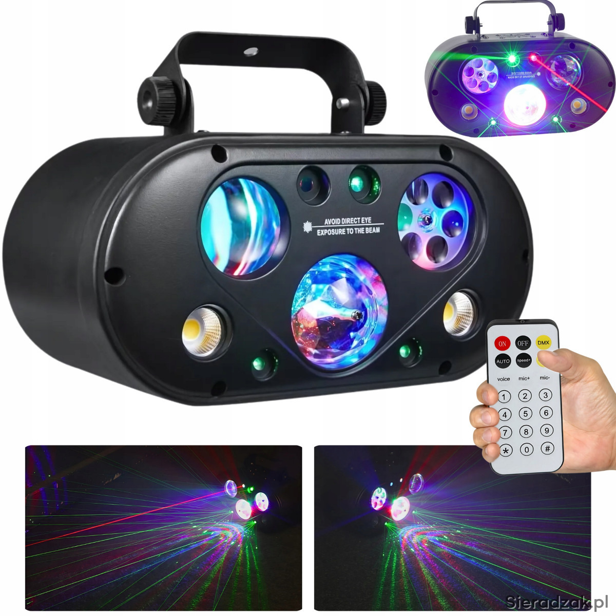 Połączenie 6-efektów w jednej obudowie Led Par + disco kula + lasery + stroboskop złoty + gobo wzory + water wave (fala wodna) Dzięki temu posiada duże możliwości pracy w każdych warunkach. Każdy użytkownik będzie z pewnością zadowolony mając możliwość użycia wszystkich efektów na każdej imprezie. Doskonale sprawdza się jako oświetlenie sceniczne w domach i ośrodkach kultury, podczas koncertów, różnego typu występów, gali i prezentacji, a także w klubach tanecznych, dyskotekach oraz jako oświetlenie dla mobilnych DJ-ów, zespołów i firm eventowych itp.