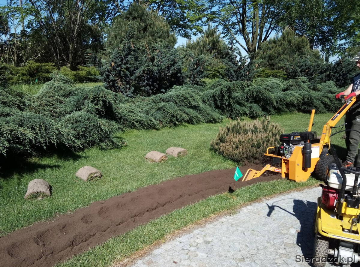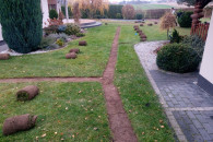 - nawodnienia zakładamy na nowych ogrodach oraz na istniejących założeniach. Ściągamy trawnik wykrawarką do darni, a instalację układamy w wąskich wykopach zrobionych koparką łańcuchową. Po 2-3 tygodniach nie ma śladu ingerencji w trawnik.