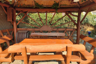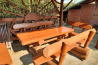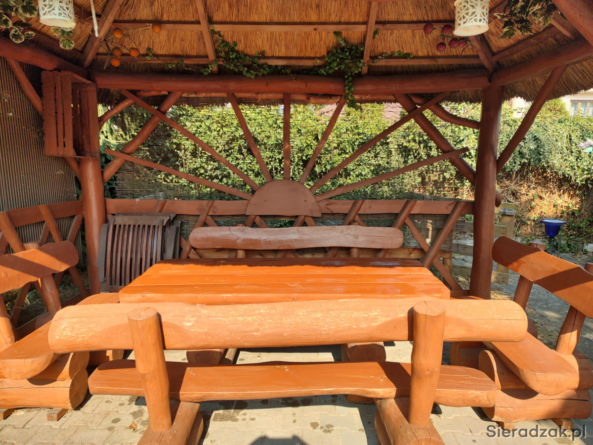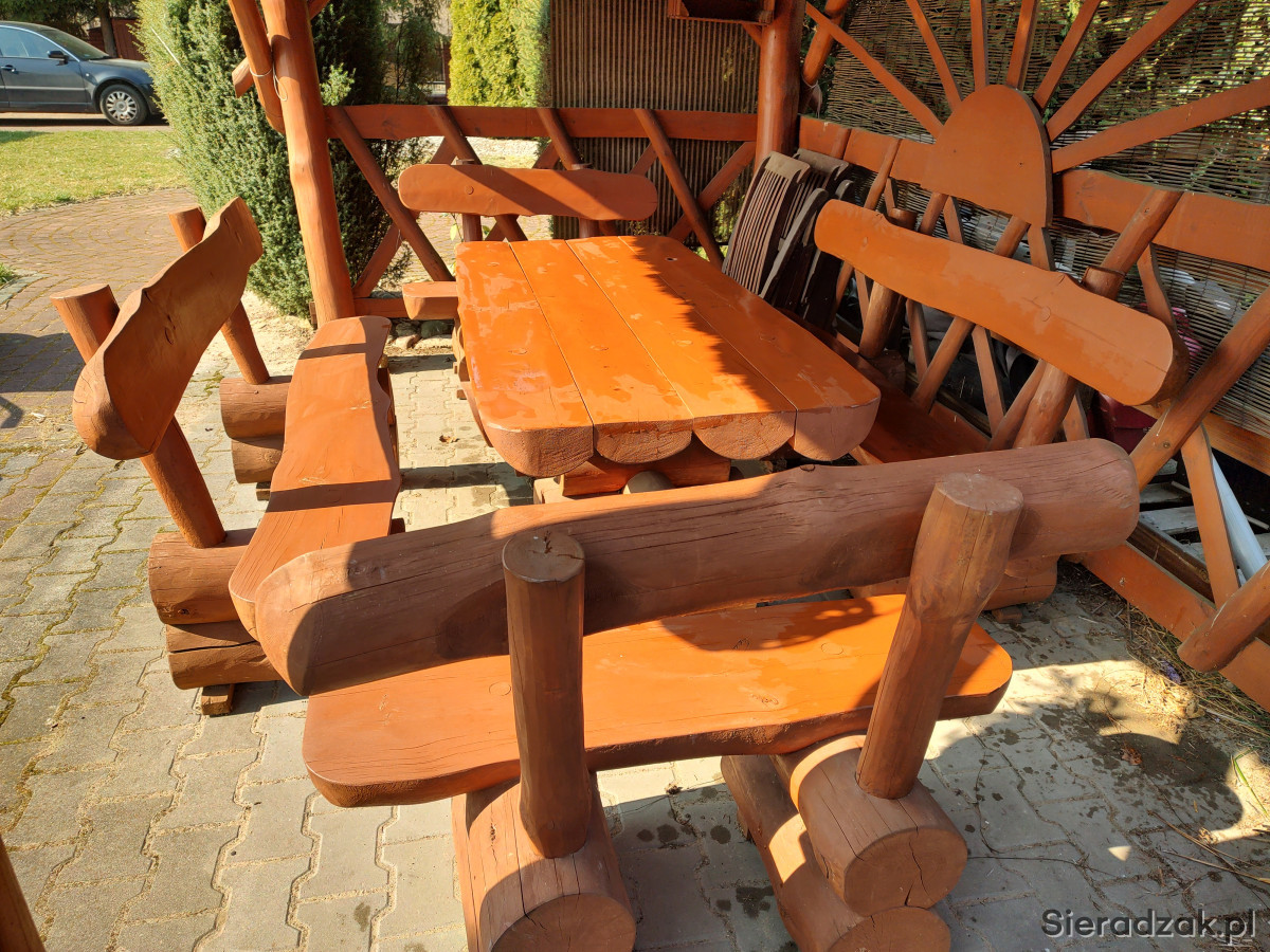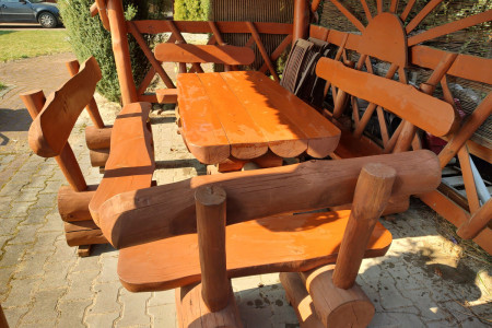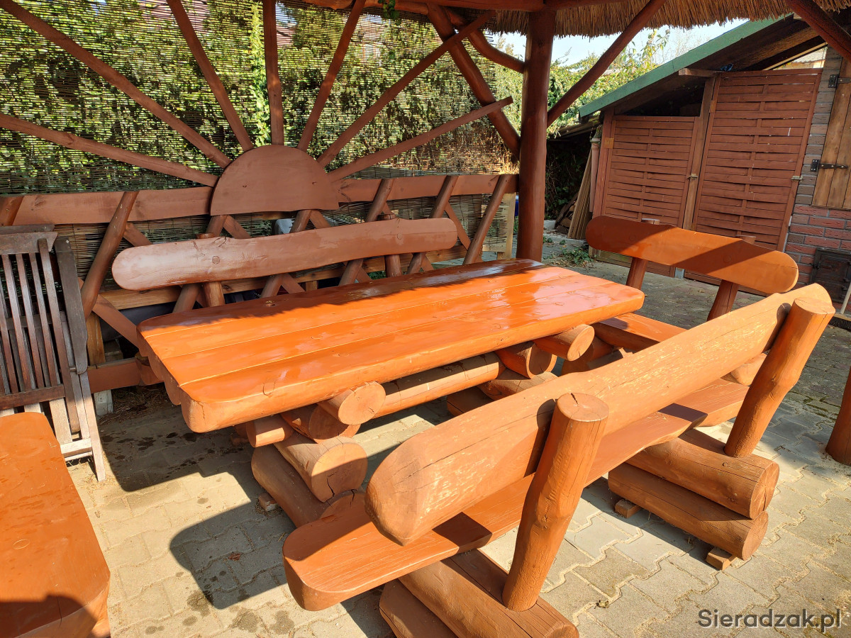 Drewniane meble z półbala. Używane , ale stan bardzo dobry. W zestawie stół 180 cm, 2 długie ławy po 180 cm, 2 krótkie ławki po 110cm.