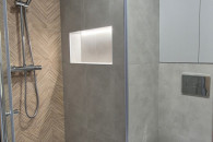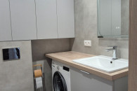 W łazience znajduje się pralka, wygodny i nowoczesny prysznic oraz szafki.