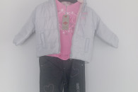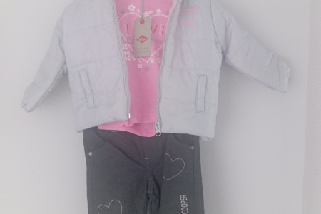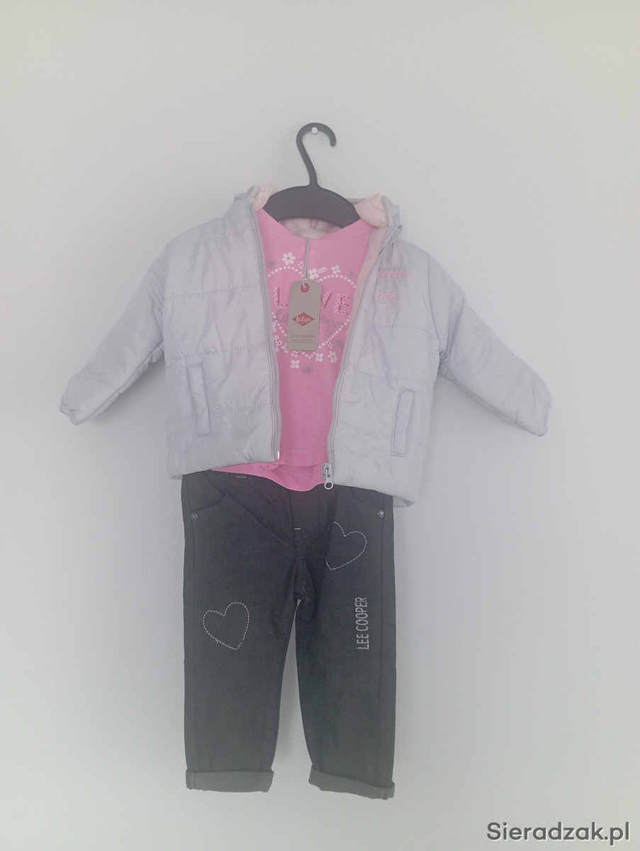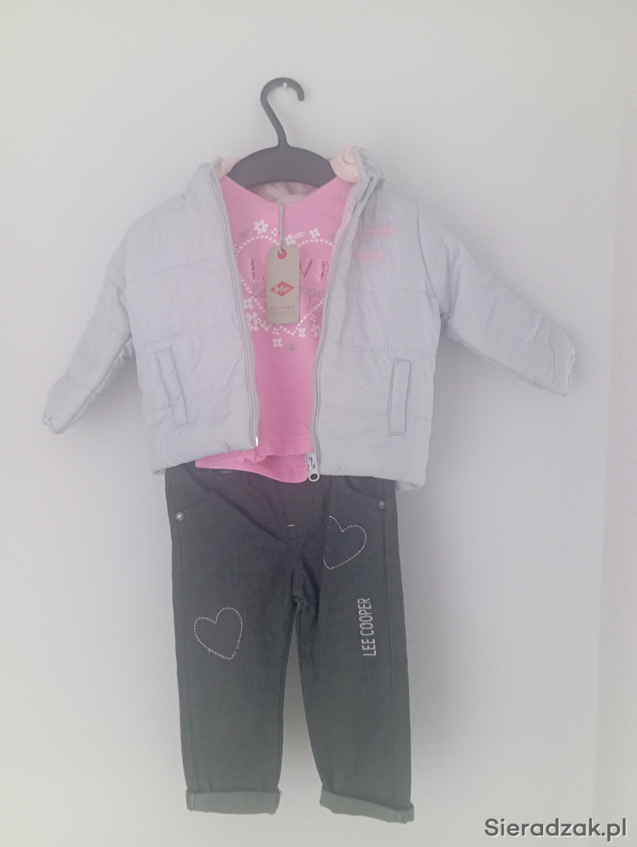 Komplet dla małej dziewczynki na rozmiar(12 M) w tym spodenki jeansowe, bluzka, kurtka wiosenno-jesienna. Firmy Lee. Idealny prezent na roczek.