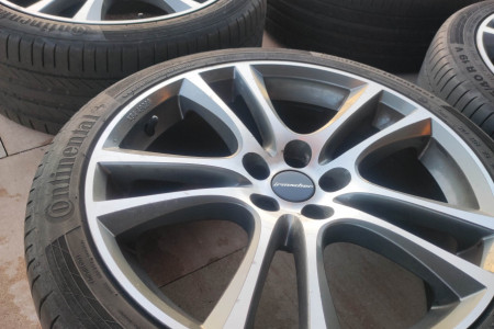 Opony Continental (2011r., 235/40 R19, bieżnik 4-5mm). Jedna opona na pewno do wymiany z racji uszkodzenia - widoczne na zdjęciu. Sprzedaję je w komplecie z alufelgami.