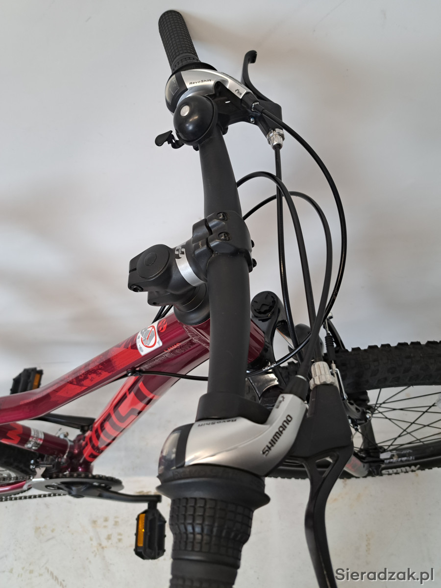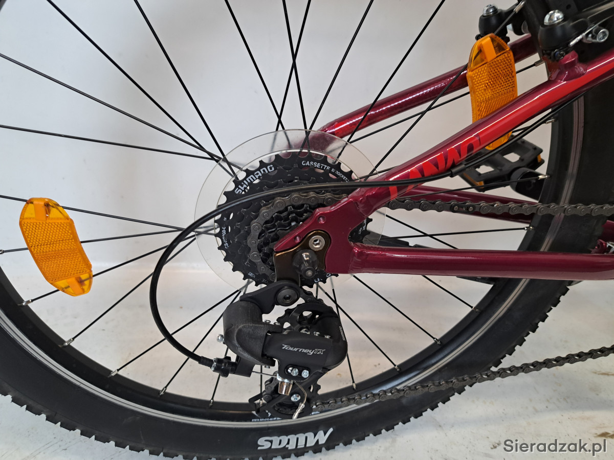 rama aluminium,przerzutki shimano tourney,manetki revoshift shimano,napęd 3x8,amortyzator sr suntour xct,hamulce v-brake tektro,opony mitas.