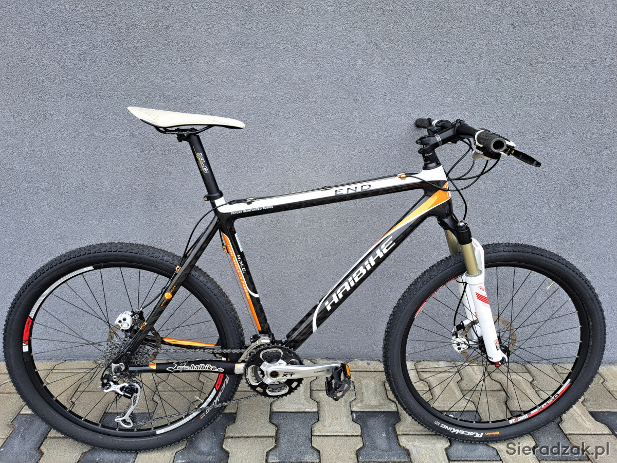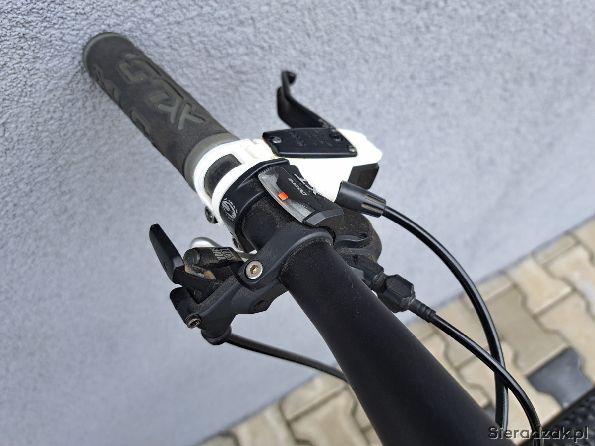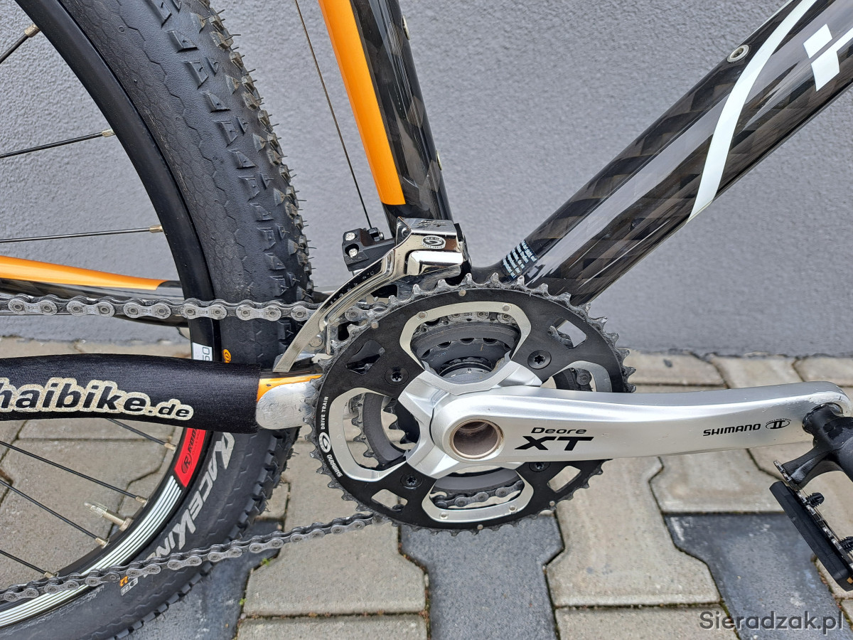 rama carbon 21" 53cm,napęd 3x9,osprzęt shimano deore xt (przerzutki,manetki,korba),hamulce hydrauliczne louise 180/160mm,amortyzator rock shox reba z blokadą skoku,blokada manetką przy kierownicy,siodło fizik,opony continental race king,obręcze dt swiss,rodi.stan bardzo dobry.
