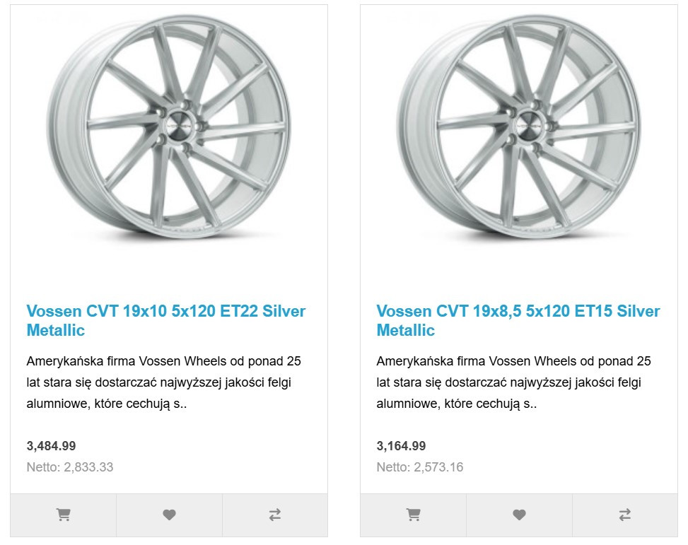 Witam, mam do sprzedania koła Vossen CVT 19 5x120 8,5J ET 15 i 10J ET 22 z letnimi oponami 275/30/19 Pirelli Pzero 2019 r. 5mm para i Continental Sport contact 2023 r. 5mm para felgi proste nie spawana jedna tylko dostała, strzała, więc do spawania prostowania i lakierowania lub dokupienie sztuki, gdzie tylko na zamówienie i przy tym opona ucierpiała i jest pęknięta nowe opony koło 5 tys. nowe felgi same 8,5 J 3,164,99 ZŁ sztuka 10 J 3,484,99 ZŁ sztuka możliwość sprzedaży bez opon lub wymiana na takie same, ale na 5x112 cena do negocjacji jeździło to na BMW e60 z racji, że mam auto 5x112 i muszę mieć adaptery zmieniające rozstaw felg niestety nie upcham ich w dodatku niskie et możliwość wysyłki lub odbiór osobisty proszę pisać pozdrawiam i zapraszam również na inne moje ogłoszenia.
