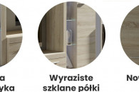 Kompozycja Rumba XL jest ponadczasowa i została zaprojektowana w 4 wersjach kolorystycznych: dąb sonoma, biały, dąb lefkas, beton jasny + biały. W skład meblościanki Rumba XL wchodzą 2 wysokie witryny stojące, stolik RTV oraz półka wisząca. Całość tworzy doskonały zestaw dla wszystkich łaknących ogromnej ilości miejsca do przechowywania. Kompozycja została wykonana z wysokiej jakości płyty laminowanej 15mm odpornej na zanieczyszczenia. Meblościanka posiada szklane półki, które opcjonalnie możesz podświetlić oświetleniem LED, stwarzając tym samym reprezentacyjne miejsce na pamiątki z wakacji, ulubione dekoracje lub kosztowności. Wszechstronny stolik RTV pozwala na umieszczenie telewizora w centralnym punkcie salonu, a wygodne półki dają możliwość łatwego podłączenia sprzętu multimedialnego bez widocznych kabli. Meblościanka Rumba XL to geometryczna harmonia i idealna kompozycja dla wielbicieli eleganckiego minimalizmu.
