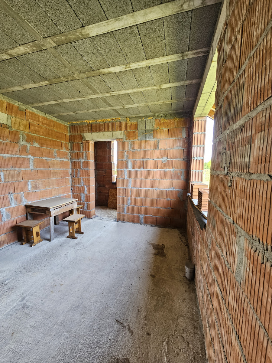 Dom według projektu miał zostać zaprojektowany z ścian zewnętrznych trójwarstwowych o grubości 52 cm ( od wewnątrz pustak MAX gr 25 cm + styropian 15 cm + ścianka dociskowa z pustaka MAX gr 12 cm). Dach to pełne deskowanie + papa. Strop TERIWA.