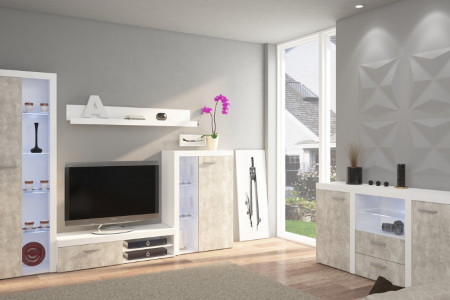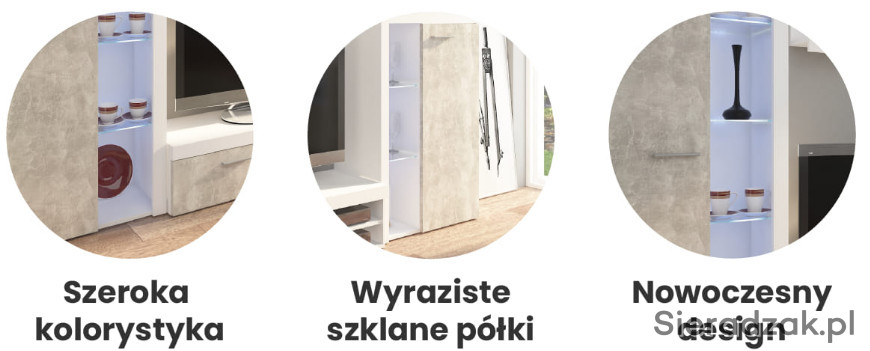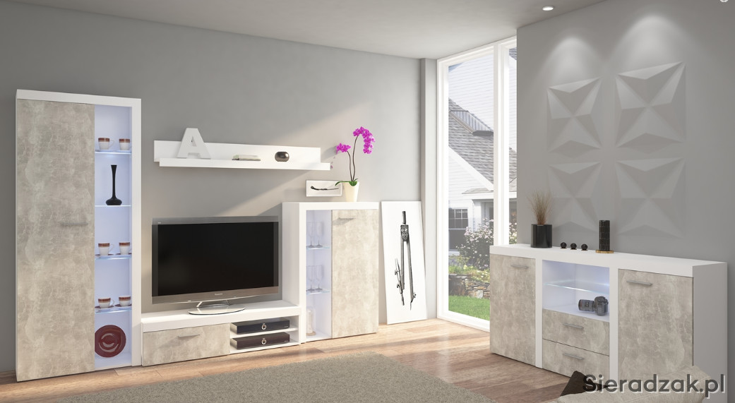 Meblościanka Rumba od STOLARZ-LEMPERT wzbogaci każdą przestrzeń życiową. Kompozycja jest ponadczasowa i została zaprojektowana w 5 wersjach kolorystycznych: dąb sonoma, biały, dąb lefkas, beton jasny + biały, old style + matera. Korpus mebli, półka ścienna i wszystkie elementy na frontach wyróżniają się naturalnym wyglądem. Meblościanka Rumba oferuje mnóstwo miejsca do przechowywania wszystkich rzeczy, które musisz pomieścić. Ponadto możesz postawić telewizor na stoliku RTV, a książki z łatwością pomieścisz na półce wiszącej. Kompozycja została wykonana z wysokiej jakości płyty laminowanej 15mm odpornej na zanieczyszczenia. Meblościanka posiada szklane półki, które opcjonalnie możesz podświetlić oświetleniem LED, stwarzając tym samym reprezentacyjne miejsce na pamiątki z wakacji, ulubione dekoracje lub kosztowności. W skład kolekcji Rumba wchodzi również Meblościanka RUMBA XL XL, która oferuje jeszcze więcej miejsca na Twoje ulubione przedmioty.
