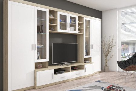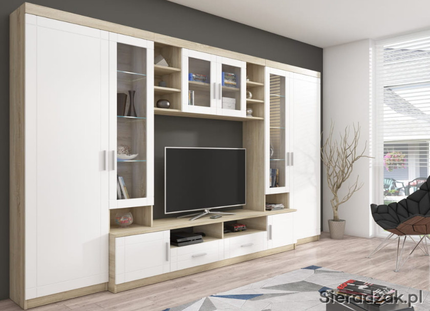 Meblościanka Paris to jednoczęściowy zestaw mebli do salonu, na który składa się kilka zintegrowanych elementów. Połączenie nowoczesnych mebli do salonu w kolorze dąb sonoma tworzy przyjazną i przytulną atmosferę w Twoim domu. Meble oferują zarówno cenną przestrzeń do przechowywania, jak i miejsce na prezentację ulubionych przedmiotów i ozdób. W zakres kompozycji wchodzi również opcjonalne oświetlenie LED, które podkreśli całą aranżację, stawiając Twoje ulubione przedmioty w centrum uwagi. Najwyższa jakość wykonania plasuje meblościankę Paris na pierwszym miejscu wśród najbardziej wszechstronnych mebli salonowych.
