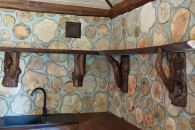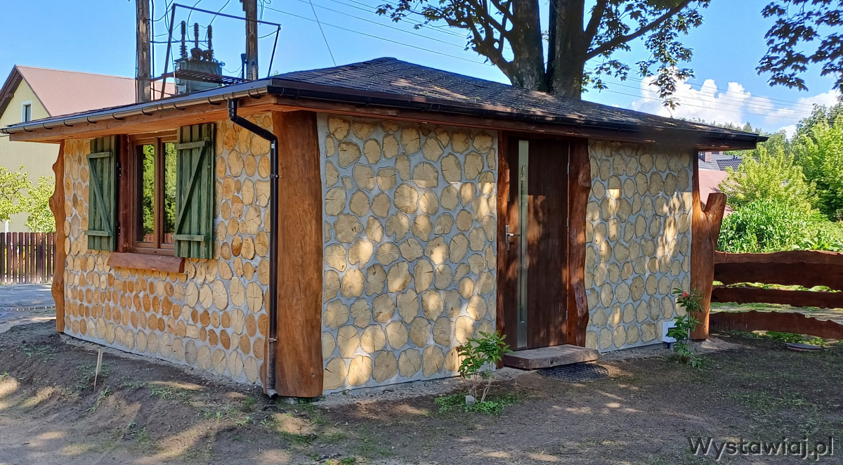 - Mauerwerk der Wände aus Laubholzstämmen, dreischichtig unter Verwendung von Dämmung, insgesamt 36 cm.