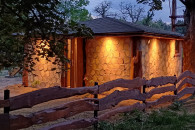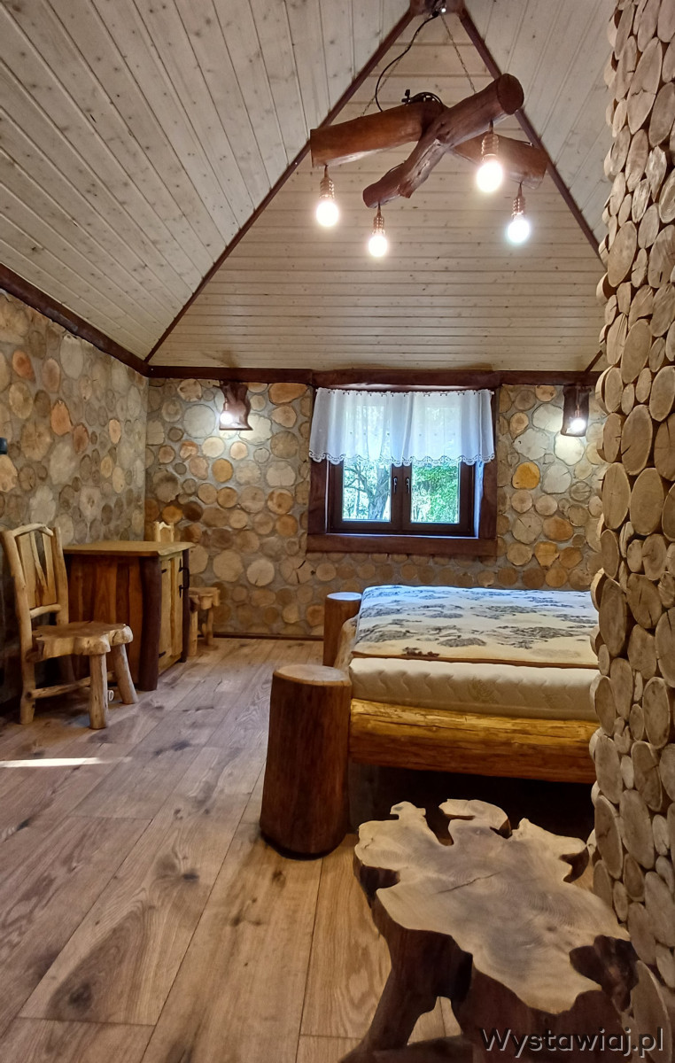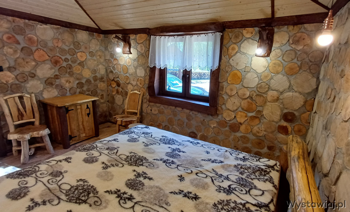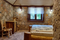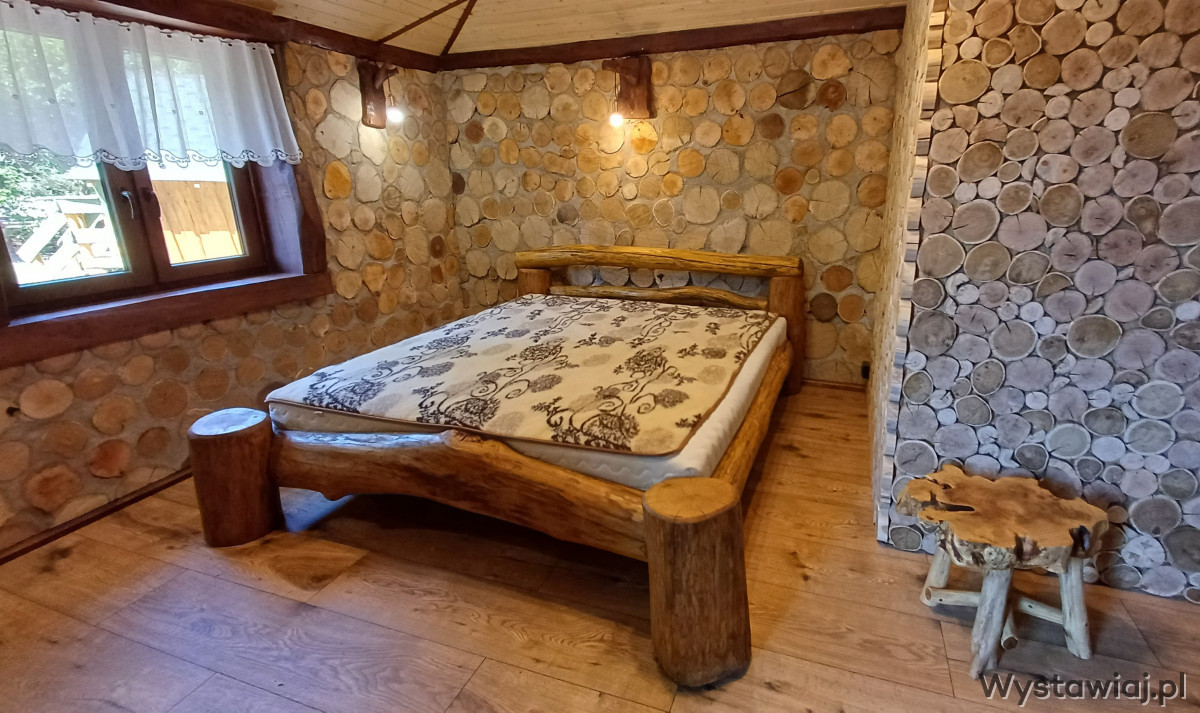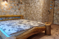 - Betten (180 x 200 cm) aus Rundholz.