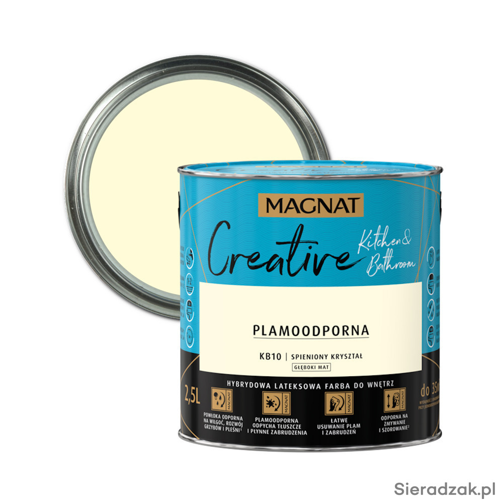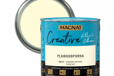 MAGNAT CREATIVE KITCHEN&BATHROOM to lateksowa farba tworząca powłoki o hydrofobowych i oleofobowych właściwościach. Farba polecana wewnątrz pomieszczeń narażonych na okresowo zwiększające się zawilgocenie i kondensację paru wodnej, jak: łazienki, pralnie czy kuchnie.