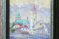 Obraz olejny na desce. Przedstawia charakterystyczny fragment ul.Krakowskie Przedmieścdie w Sieradzu, z budynkiem OSP oraz kolegiatą w tle. Obraz werniksowany, oprawiony w oryginalną, drewnianą ramę. Format obrazu -20x20cm.,a łącznie z oprawa- 28x28 cm. Autor- Cezary Zbrojewski. Stan jak na foto.