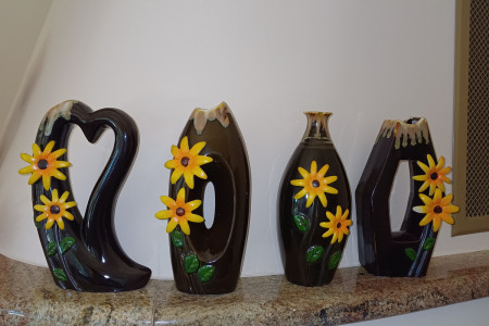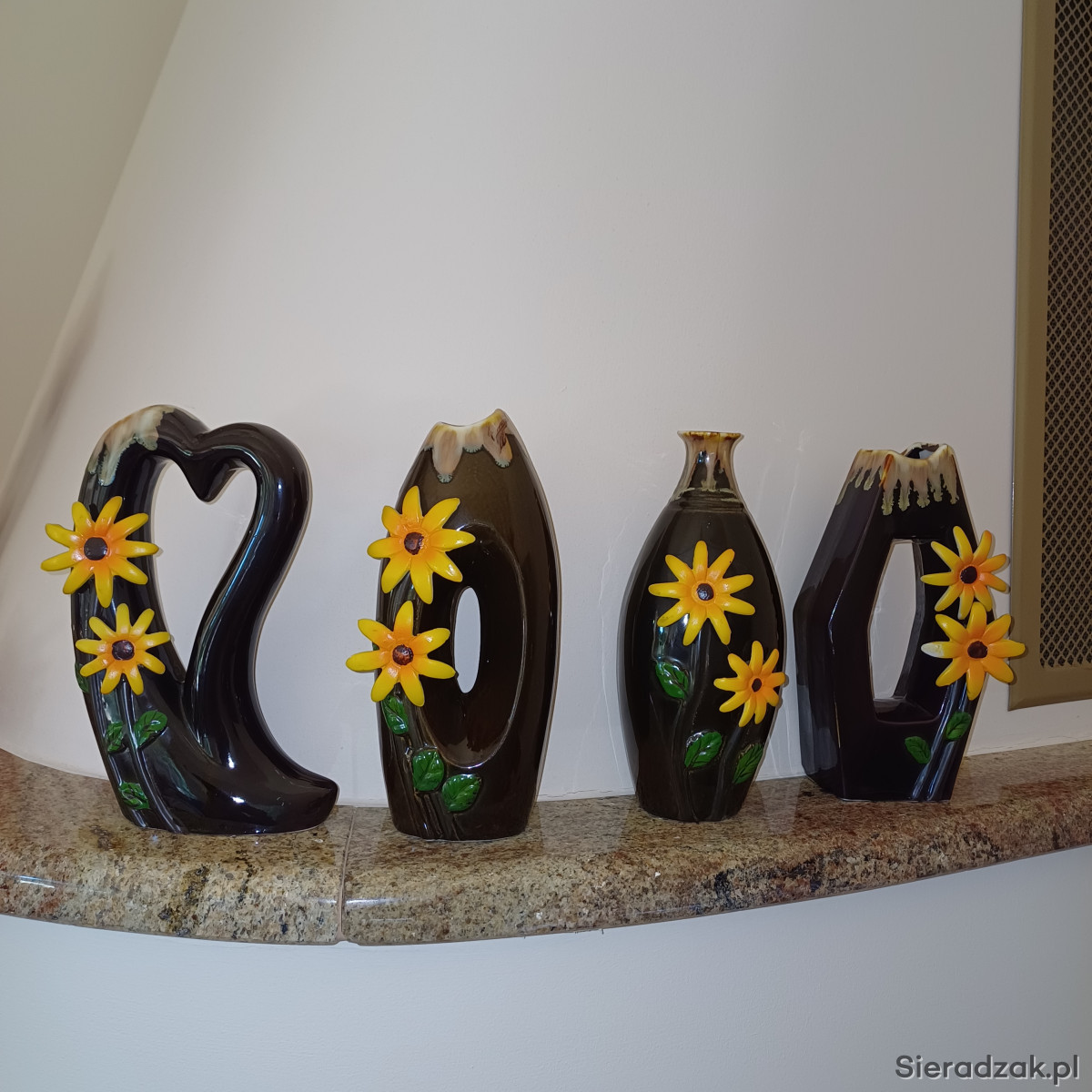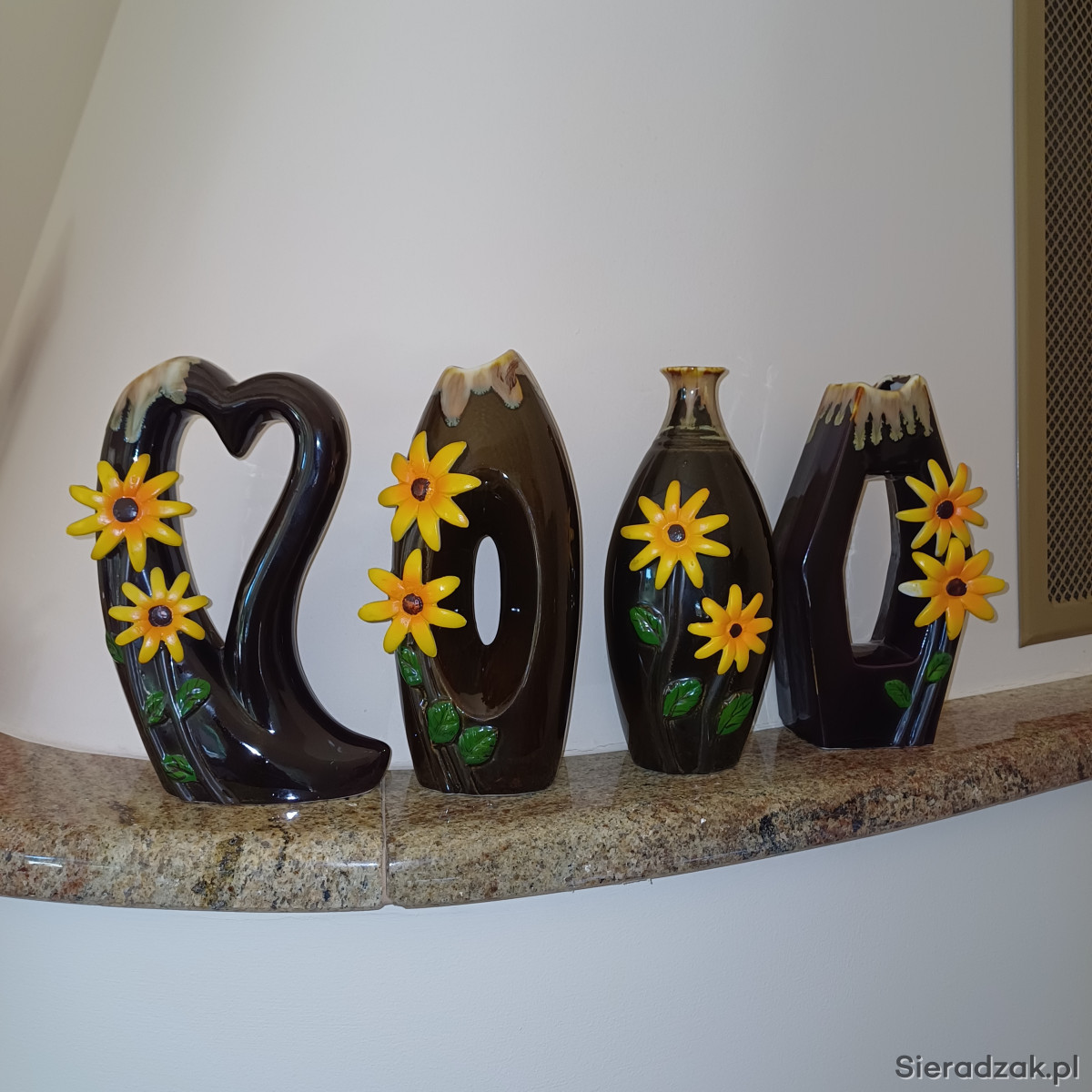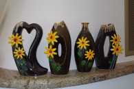 Zestaw 4 szt wazonów w kolorze brązowym z pięknie zdobionymi żółtymi kwiatkami.