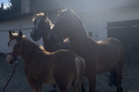 Klacz chodzi w zaprzęgu, źrebica przyuczona do zaprzęgu.