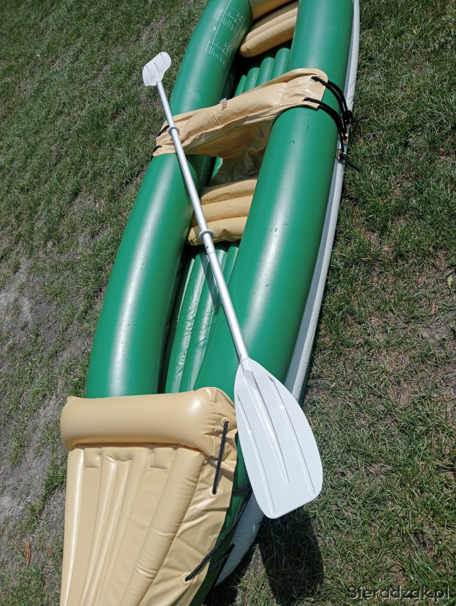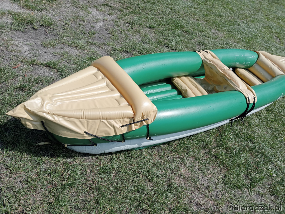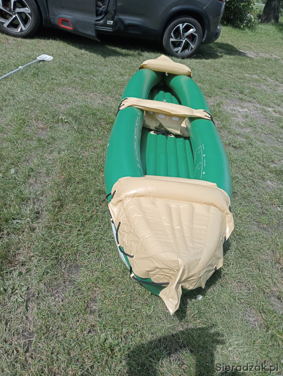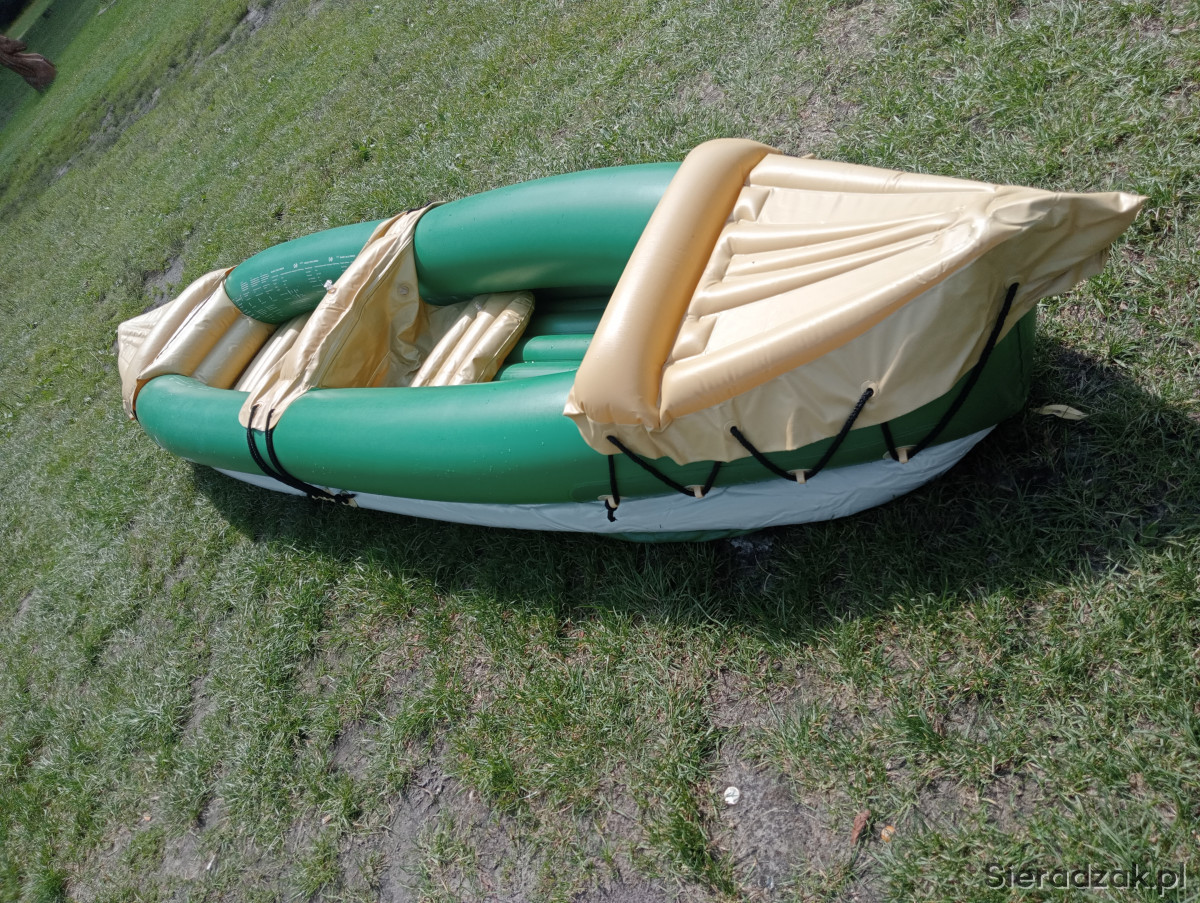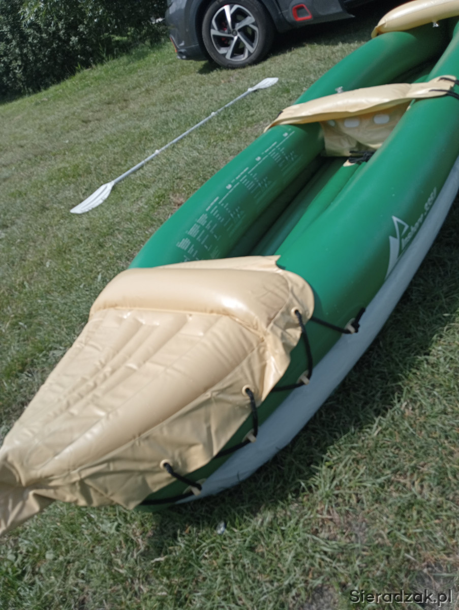 Kajak dmuchany dla dwóch osób wyposażone w jedno aluminiowe wiosło w bardzo dobrym stanie używany dwukrotnie dołączam pompkę na prąd stan bardzo dobry polecam