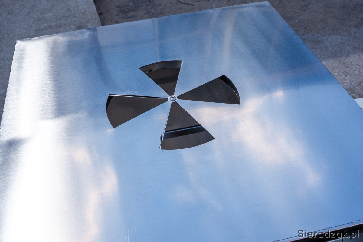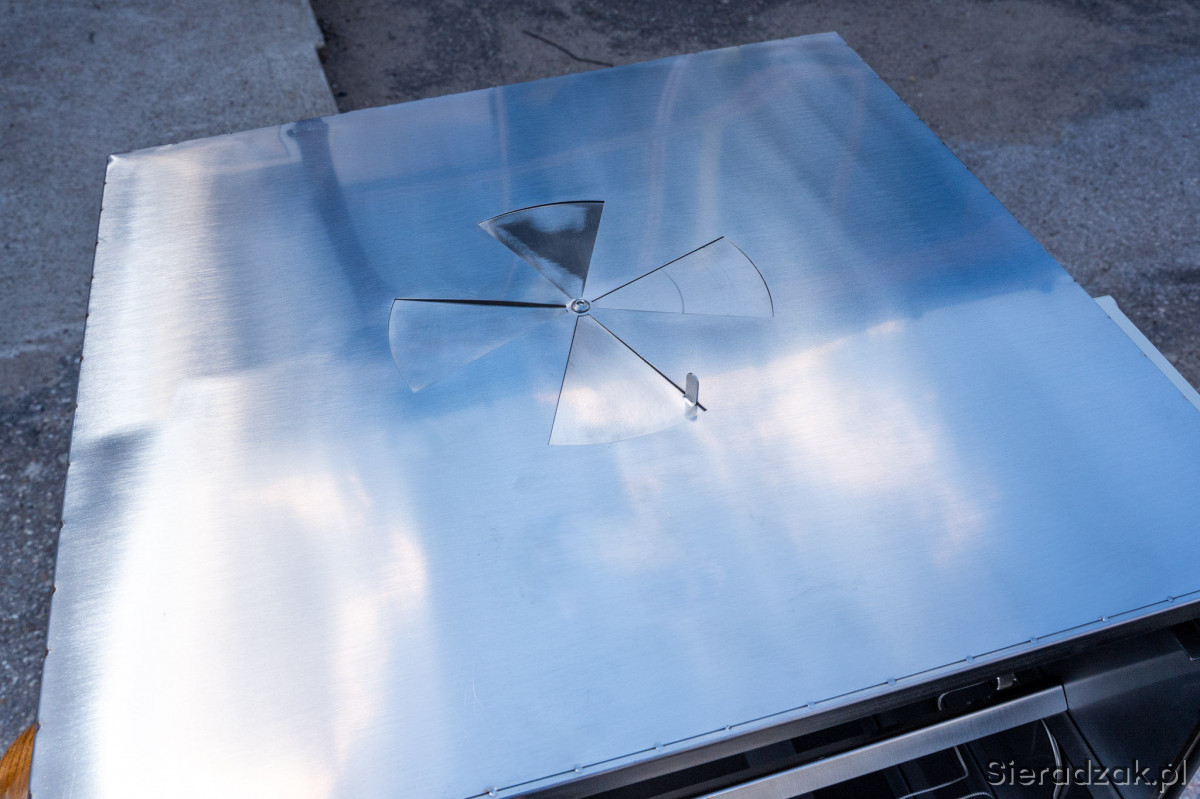 W górnej części wędzarni znajduje się regulowany szyber o dużym przekroju, który zapewnia swobodny przepływ dymu, eliminując ryzyko jego zastoju. Dzięki temu produkty nabierają pełnego, naturalnego aromatu bez kwaśnego posmaku.