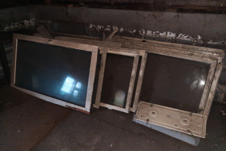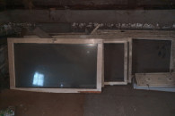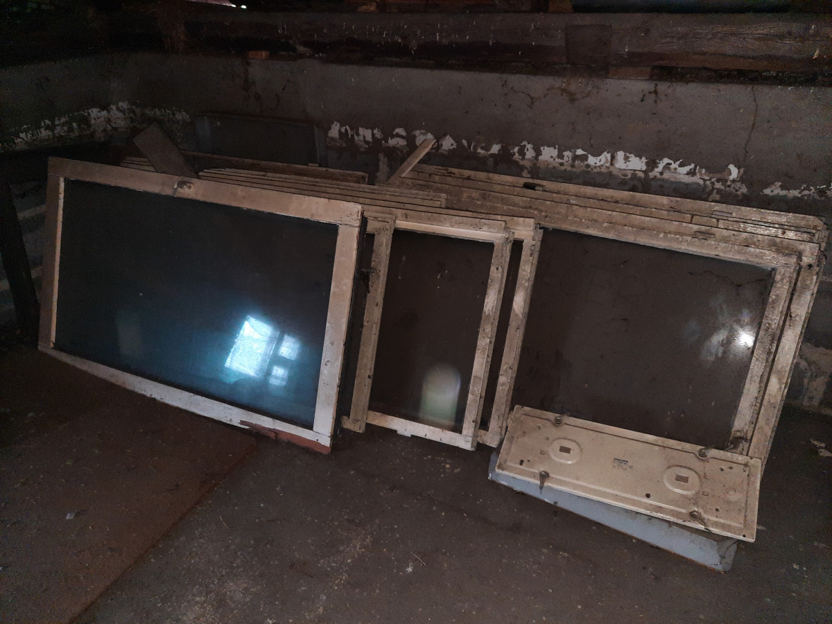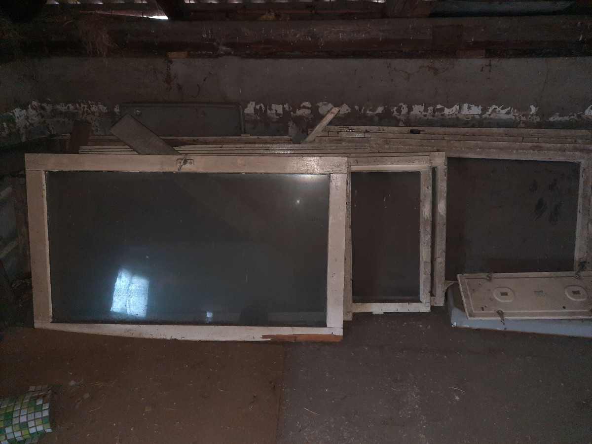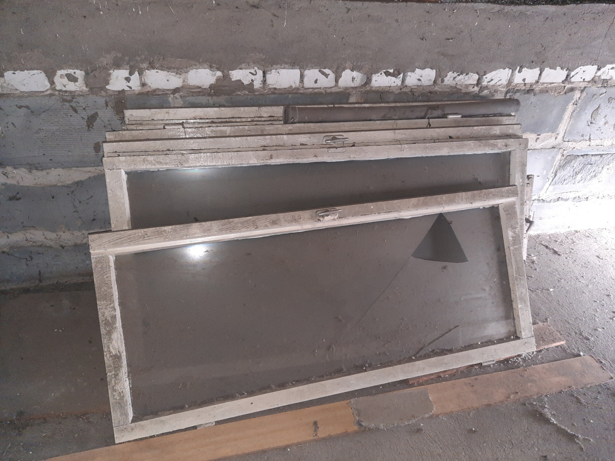 Stare okna drewniane do garażu lub warsztatu.