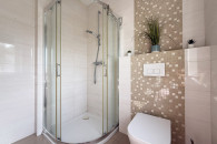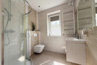 Piętro - trzy pokoje sypialniane, w tym jeden z wyjściem na balkon typu loggia oraz dwie z własną garderobą, łazienka z wc oraz korytarz.