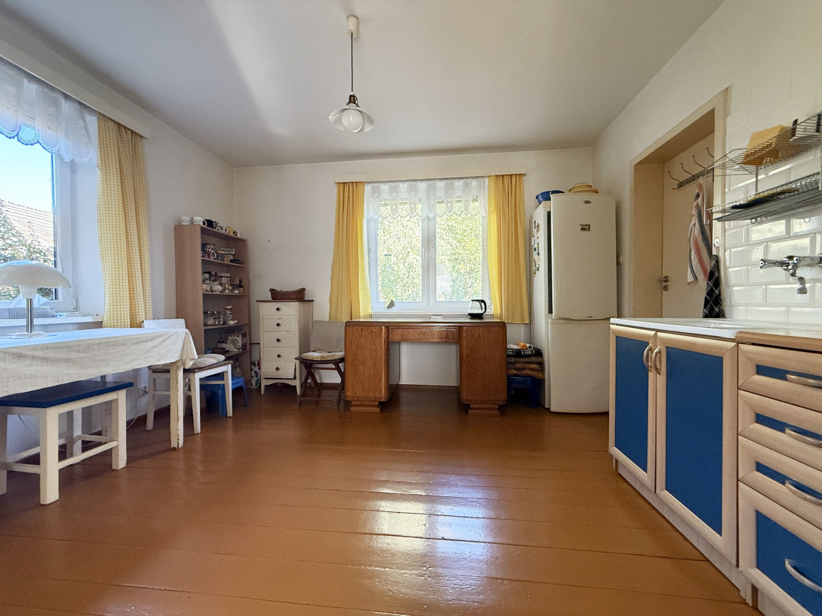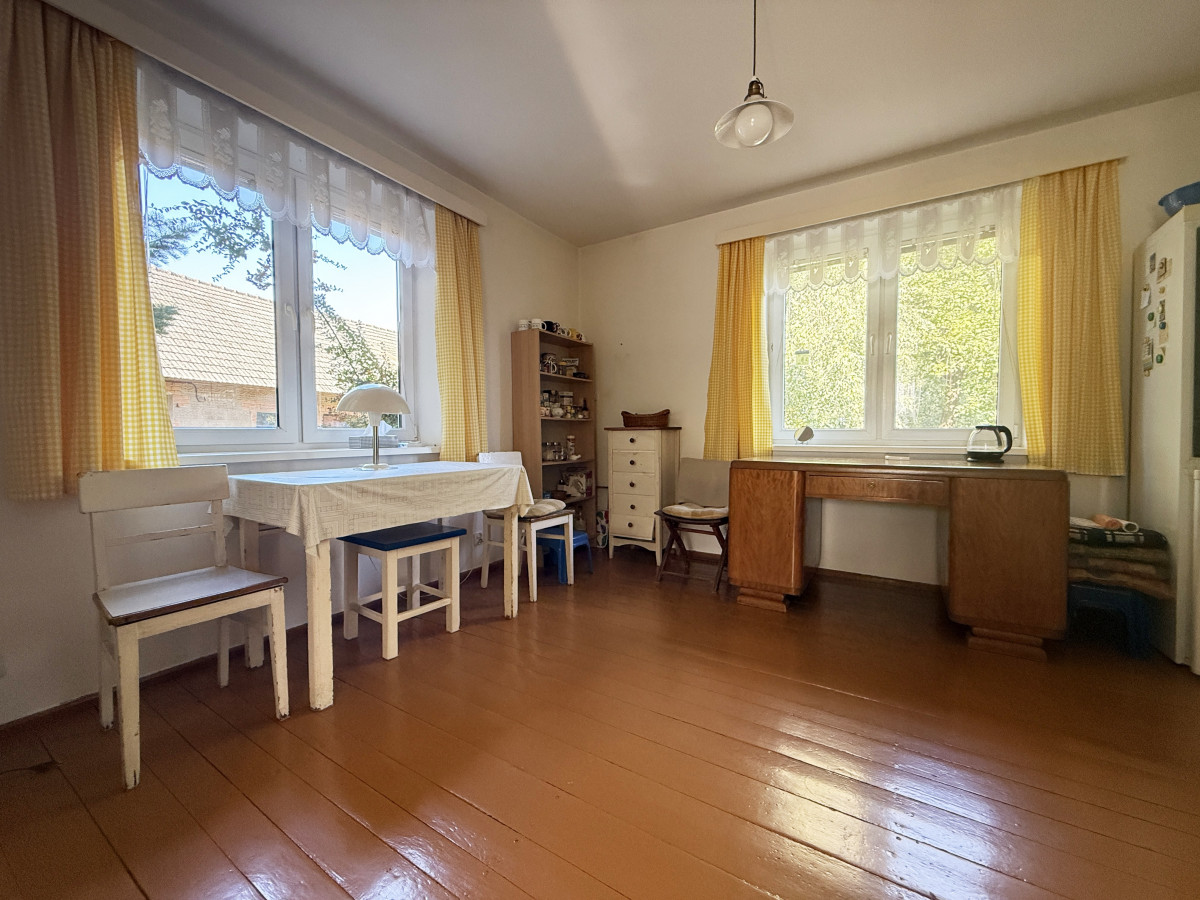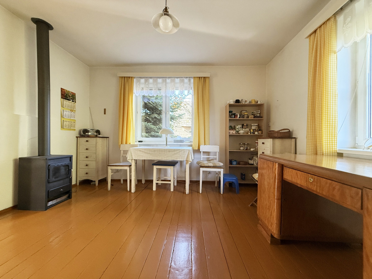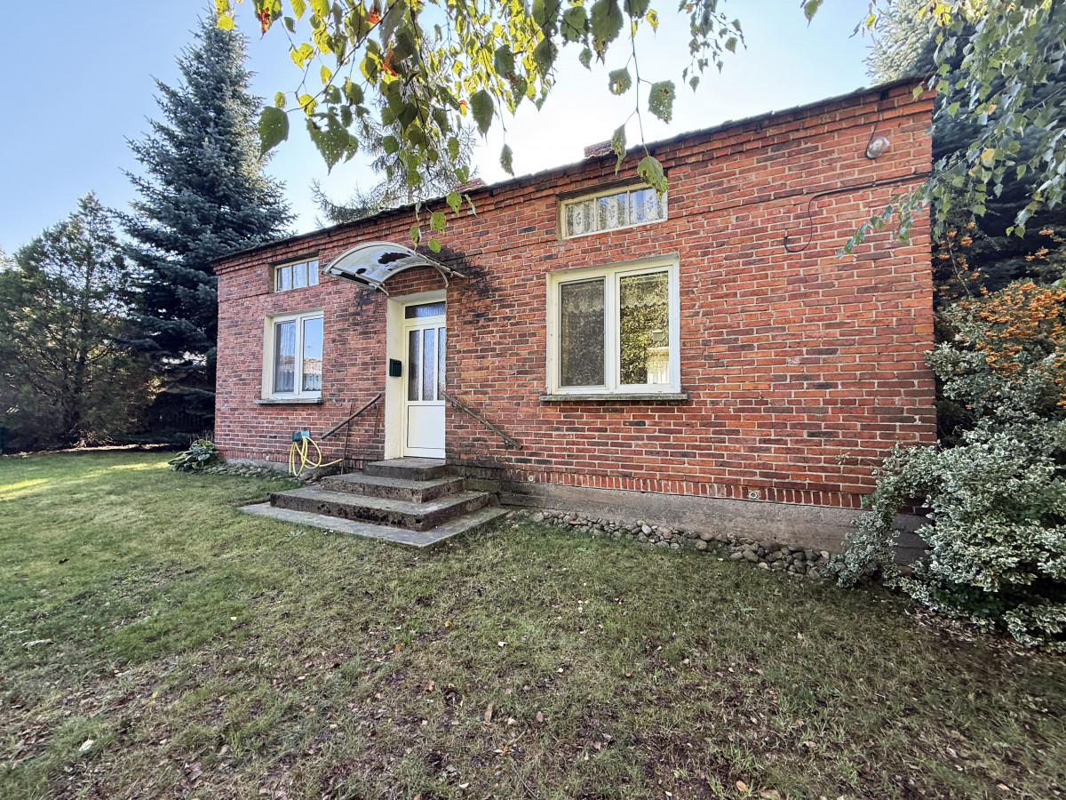 Budynek mieszkalny parterowy z użytkowym poddaszem o powierzchni około 90 m2, pobudowany w roku 78' z cegły (mur podwójny), na dachu dachówka cementowa, okna PCV dwuszybowe. Budynek nie jest podpiwniczony. Ogrzewany za pomocą trzech pieców typu koza usytuowanych w kuchni i pokojach.