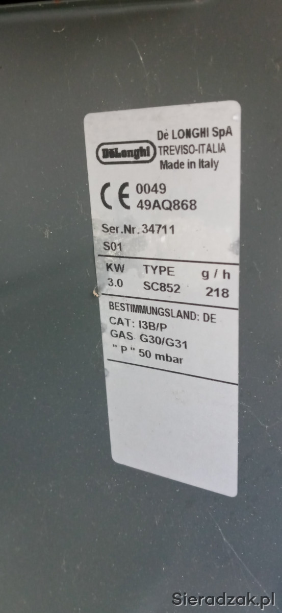 Piecyk gazowy na butlę 3,0KW De LONGHI ITALY z termostatem na kółkach promiennik