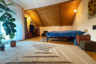 - Duży salon z aneksem kuchennym i wydzieloną strefą sypialnianą przedzieloną ścianą działową,
