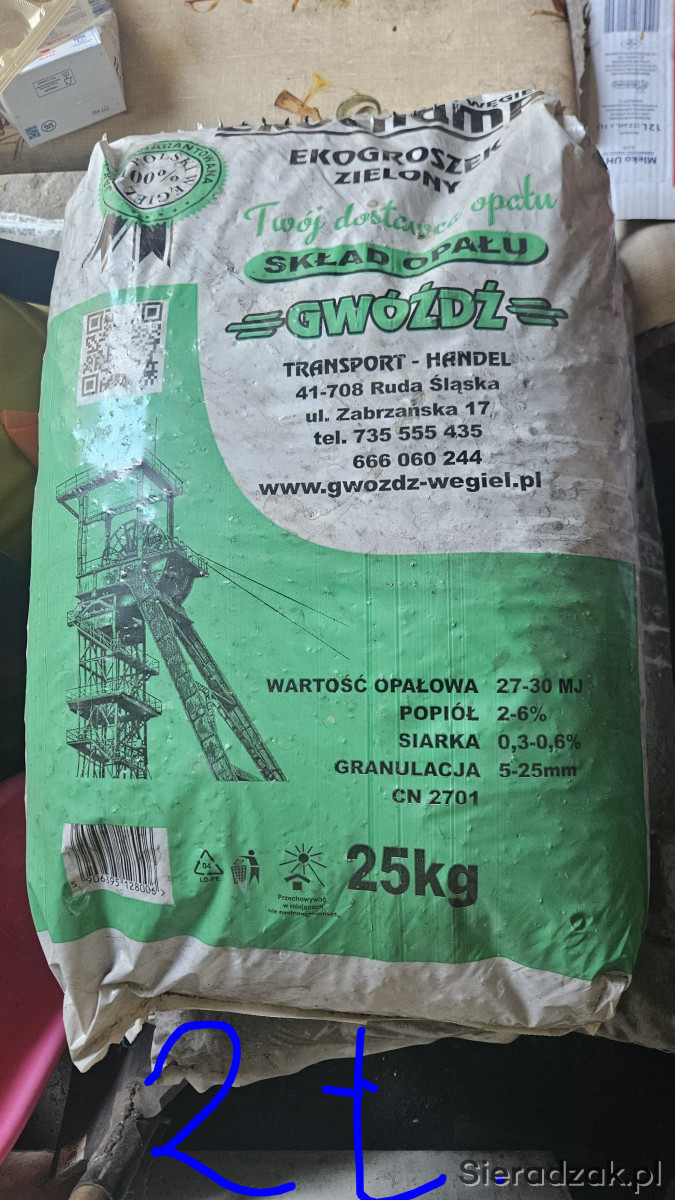 Sprzedam węgiel EKOGROSZEK firmy Gwóźdź. Ilość to 2 tony pakowane po 25 kg. Wartości kalorycznej 27-30 MJ. Worki na palcie 40 szuk .Węgiel jest kupiony 2021r, jest pozostałościom po zastosowaniu innego sposobu ogrzewania , polecam dbrze się pali i wypala .