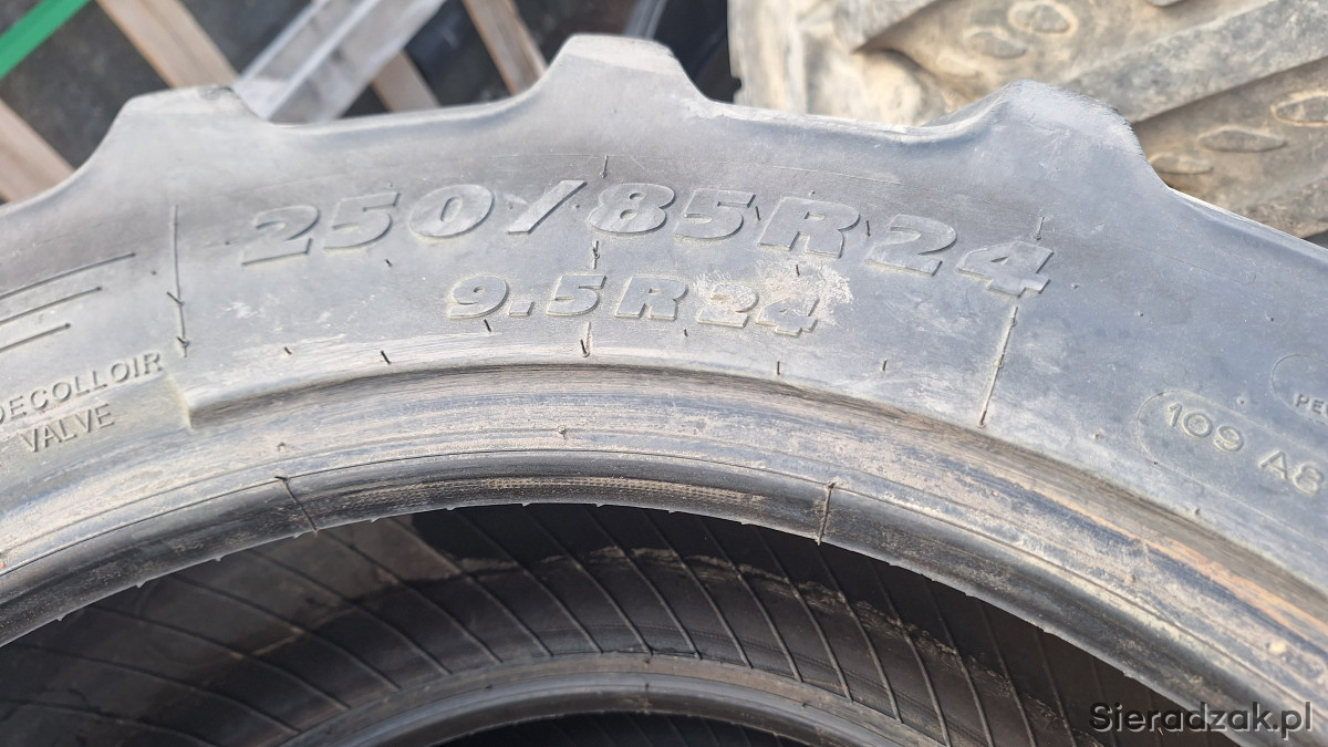 Mam do sprzedania komplet opon wąskich 250/85/24 i 270/95/38. Rocznik 2021, nienaprawiane, szczelne, świeżo ściągnięte, ciągnik zrobił na nich 2500mth. Mogę sprzedać parami. Podana cena za całość.