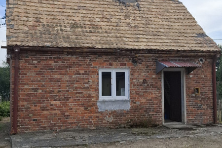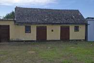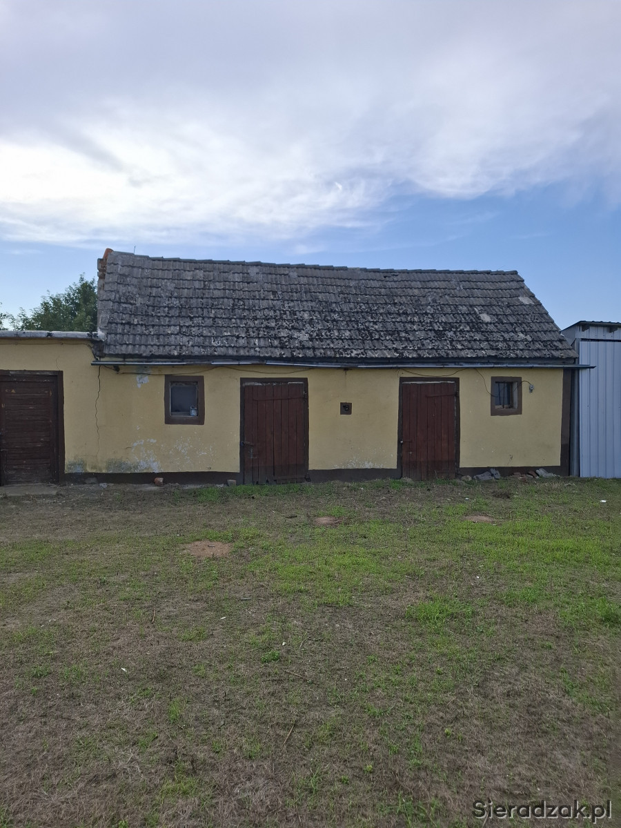 Obok domu dwa budynki gospodarcze jeden murowany obora drugi blaszany garaż.