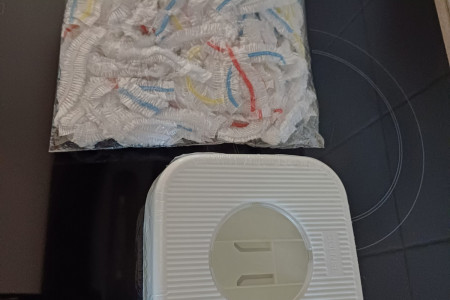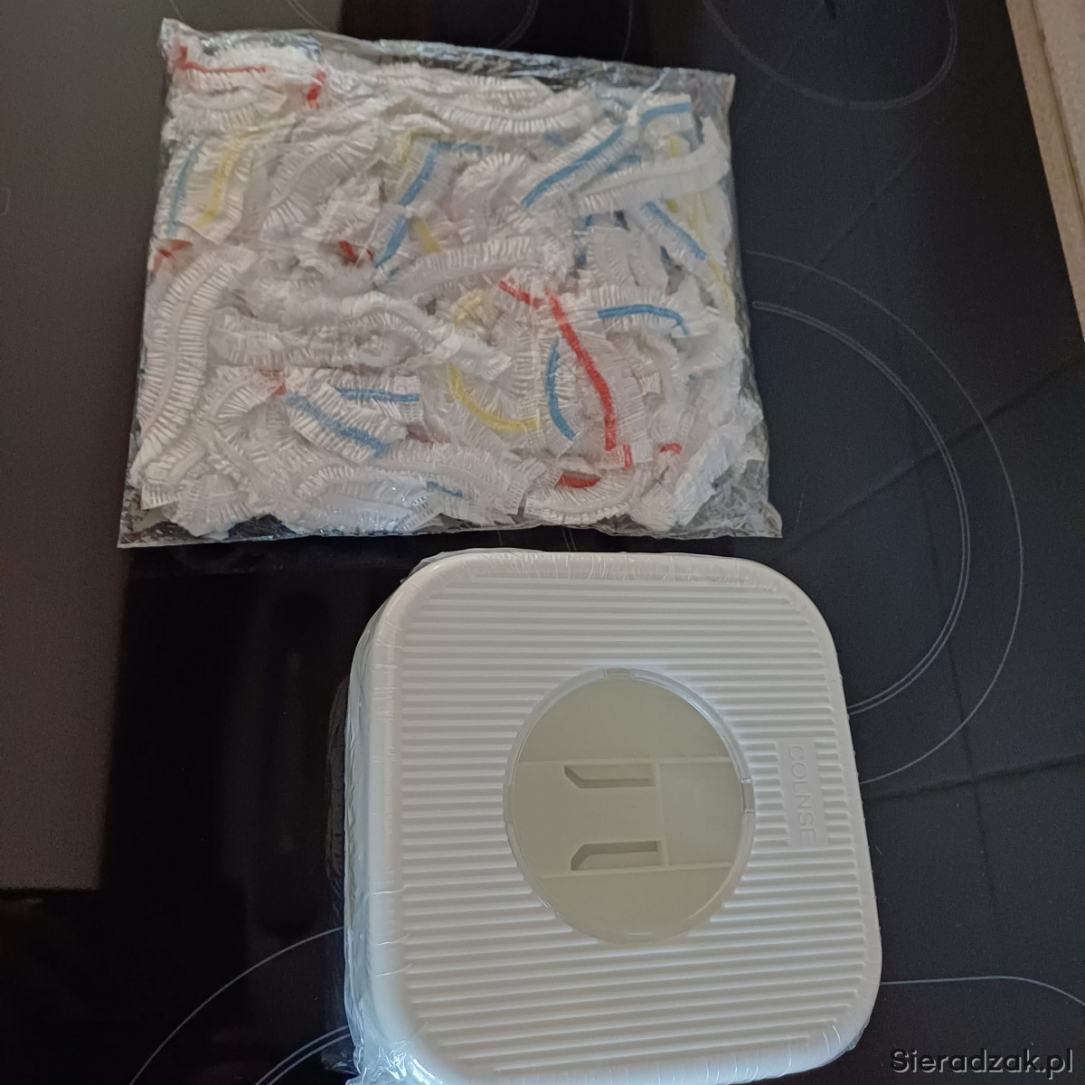 Torebki foliowe do przykrywania żywności plus pojemnik do tych folii.