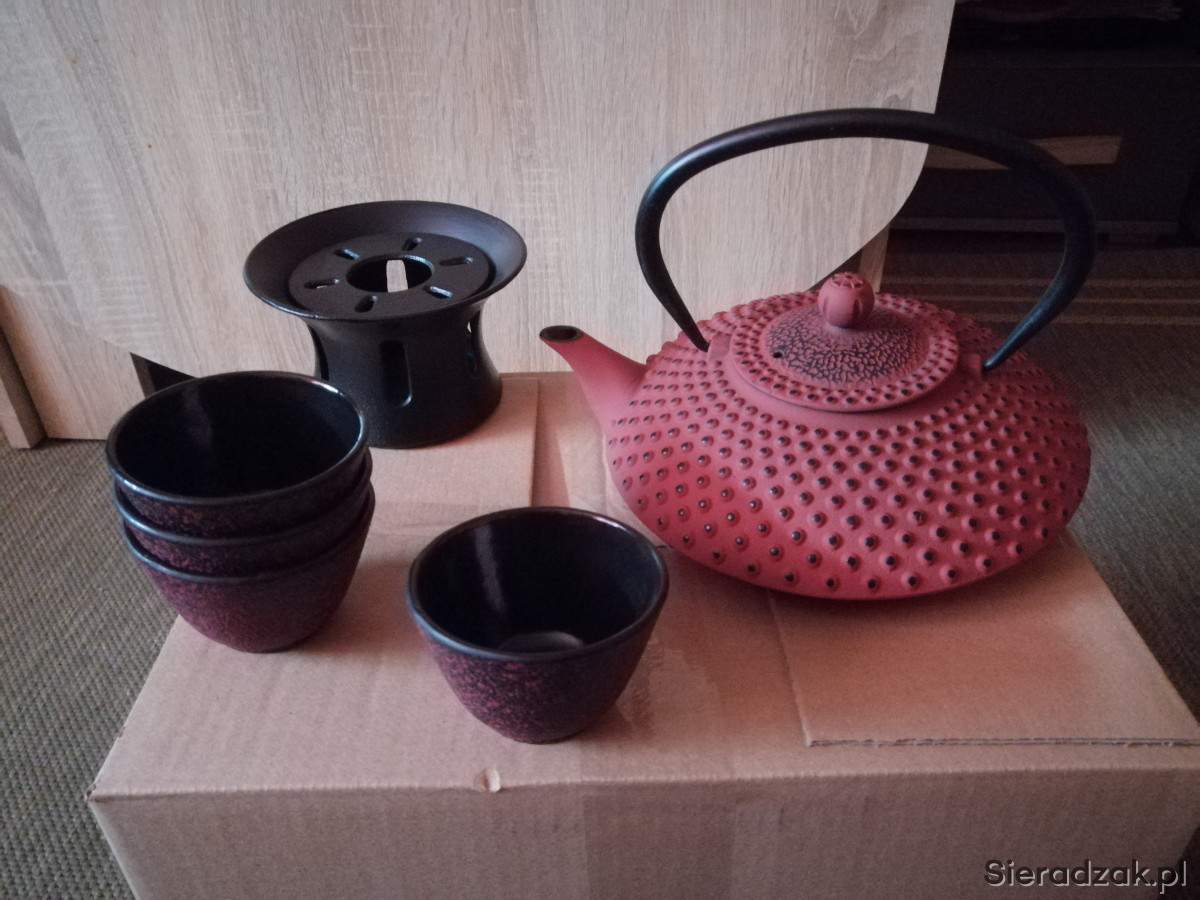 Mam na sprzedaż wspaniały zestaw zawierający: 1x żeliwny imbryk o pojemności 1.25 L wraz z zaparzaczem, 4x żeliwne czarki oraz żeliwny podgrzewacz.