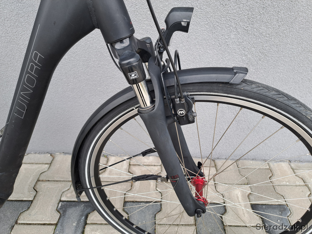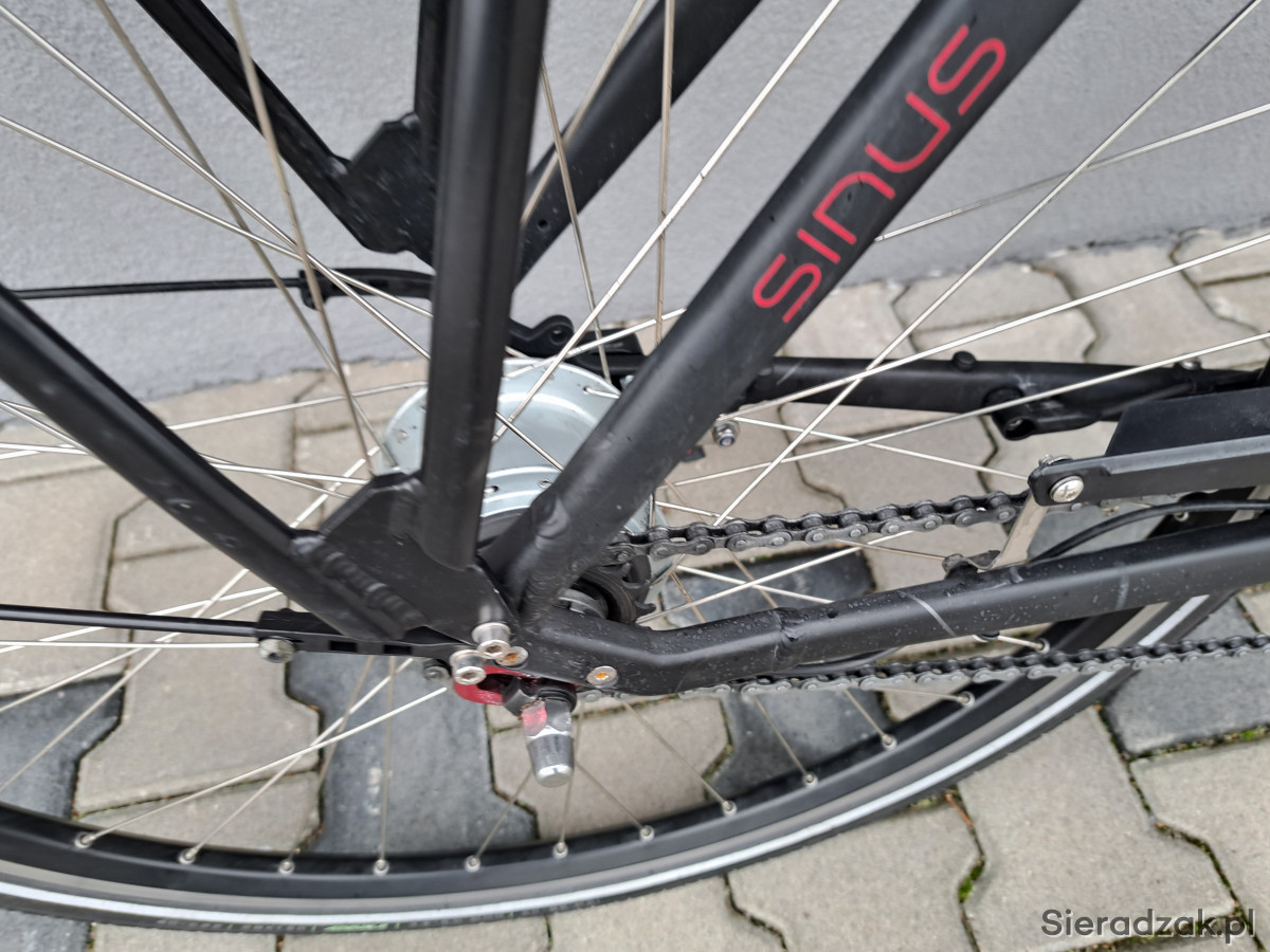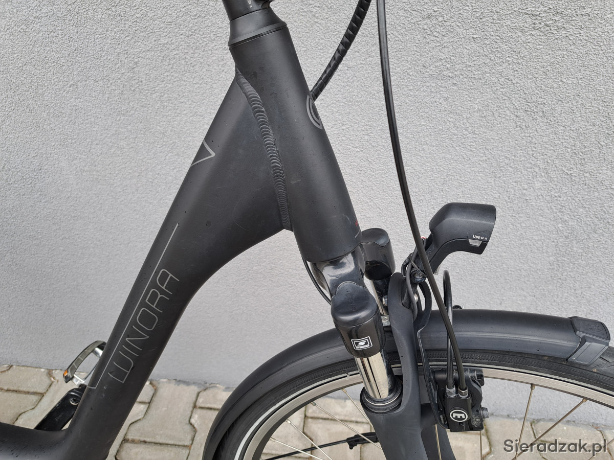 rama aluminium 22",przerzutka shimano nexus 8-biegowa w tylnej piaście,hamulce hydrauliczne magura hs11,amortyzator sr suntour nex e25,oświetlenie led zasilane z akumulatora,wspornik kierownicy regulowany,siodło żelowe z amortyzowaną sztycą ,opony schwalbe energizer.stan dobry.