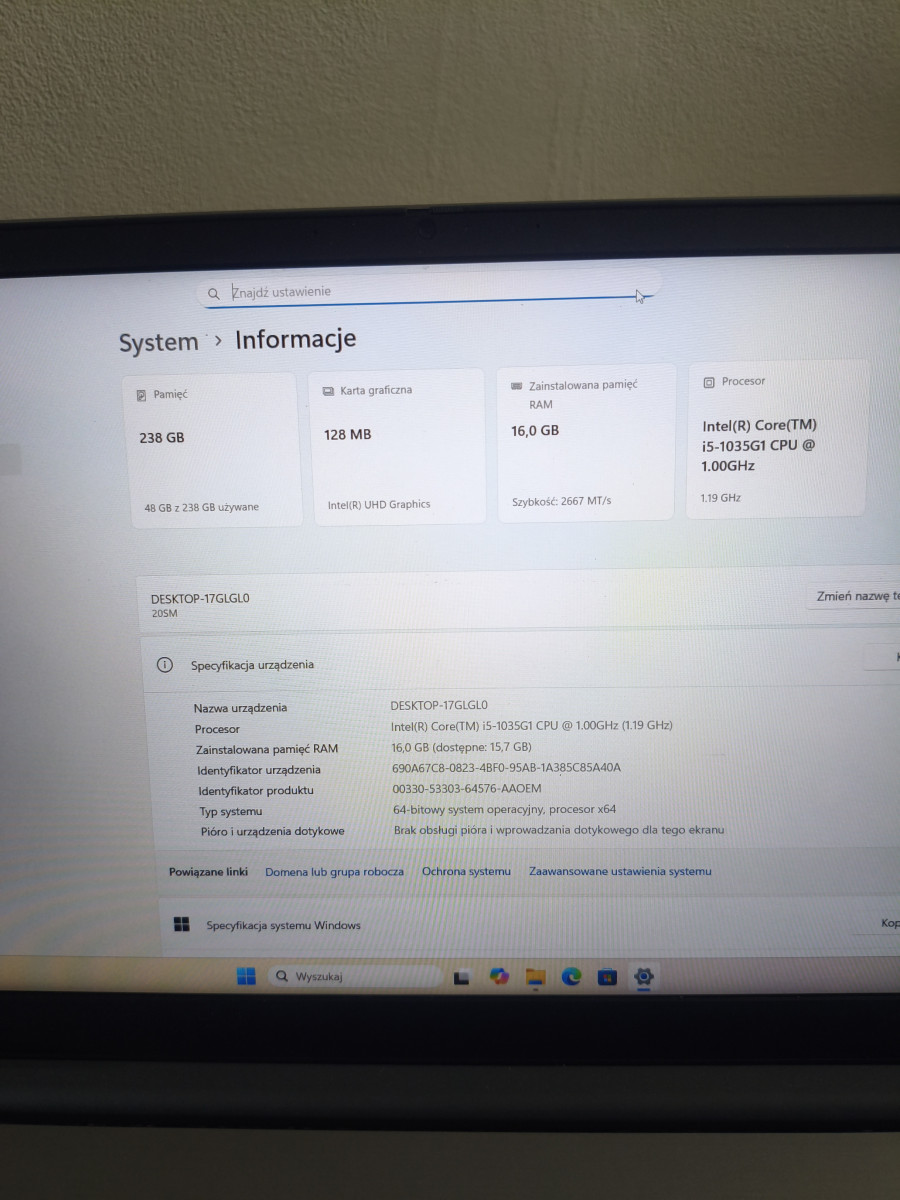 Procesor Intel core i5-10 generacji, 16gb pamięci ram oraz szybki dysk SSD 256gb M2.