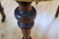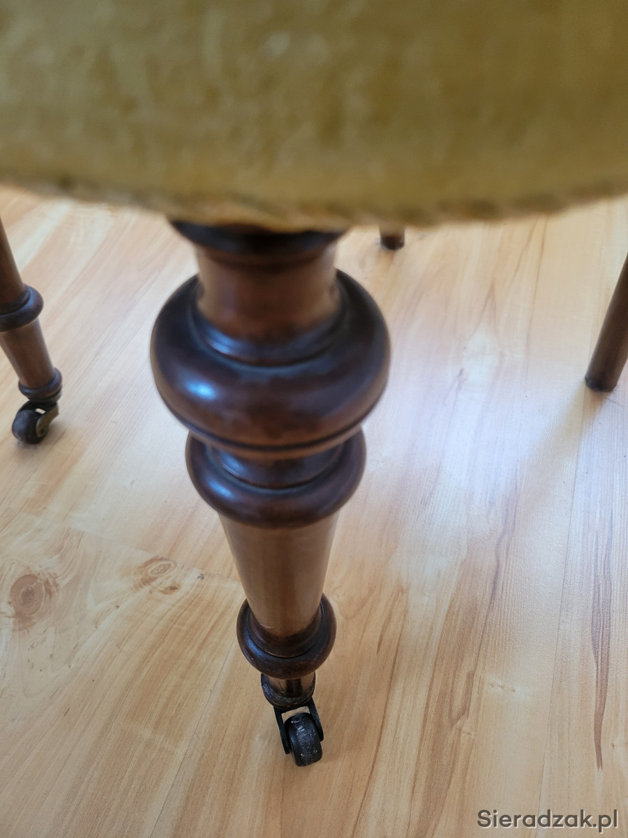 Drewniane, z toczonymi nogami i kółkami z przodu.