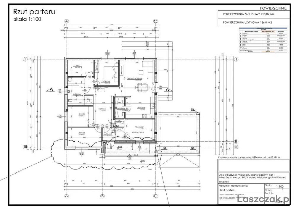 Energooszczędny dom jednorodzinny o powierzchni zabudowy 210,09 m² i powierzchni użytkowej 136 m² plus pergola garażowa 43,95m² położony na działce o powierzchni 1002 m² .