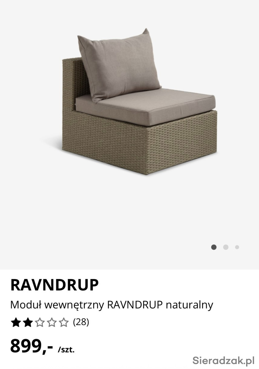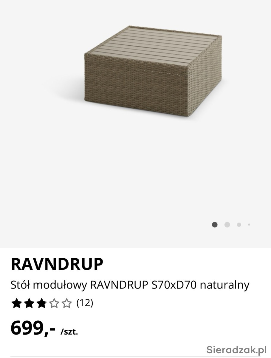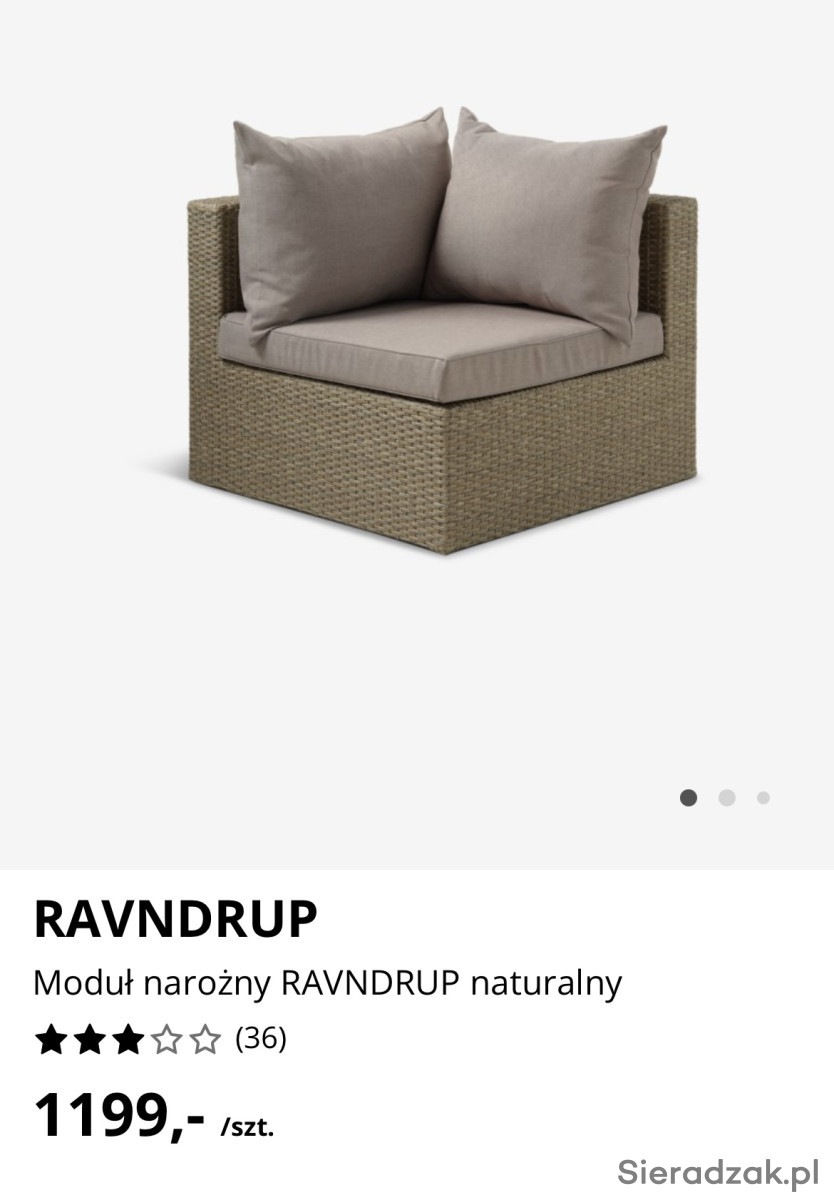 Wypoczynek ratanowy Ravendrup kupiony w tamtym roku skrzynia w tym roku . W sklepie Jysk .sprzedaję z powodu przeprowadzki. Zestaw Skrzynia ,2stoły ,5modułów wewnętrznych, 2 moduły narożne wszystkie poduszki i siedziska są .