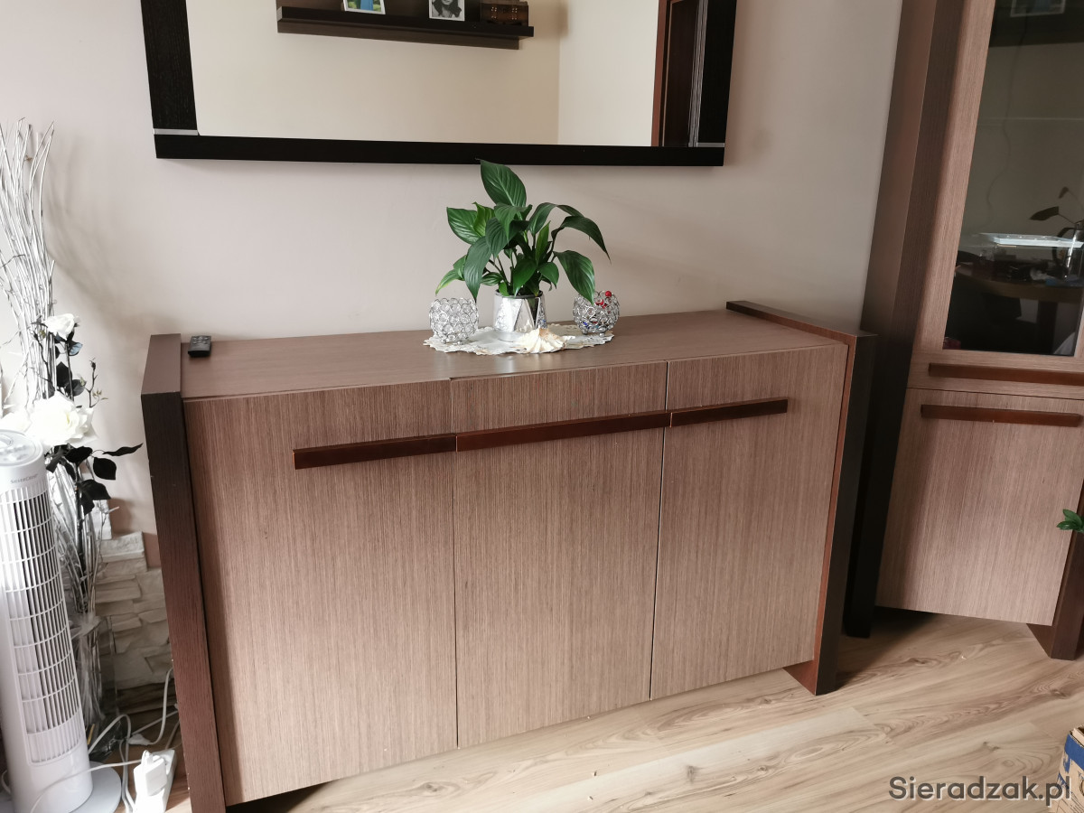 Stylowy kredens do salonu z dużym lustrem. Wykonany z wysokiej jakości materiałów, idealnie pasuje do nowoczesnego wnętrza. Posiada pojemne szafki, które pozwolą na przechowywanie różnych przedmiotów. Całość prezentuje się elegancko i funkcjonalnie.