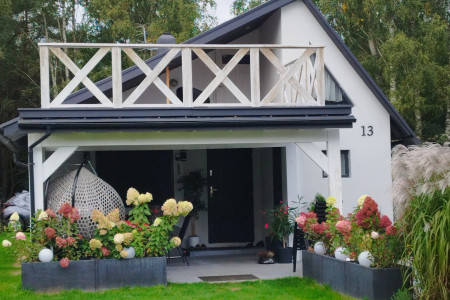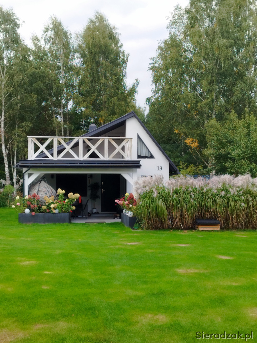 Cicha i zielona okolica – z tyłu domku las i duży plac do parkowania samochodu