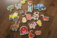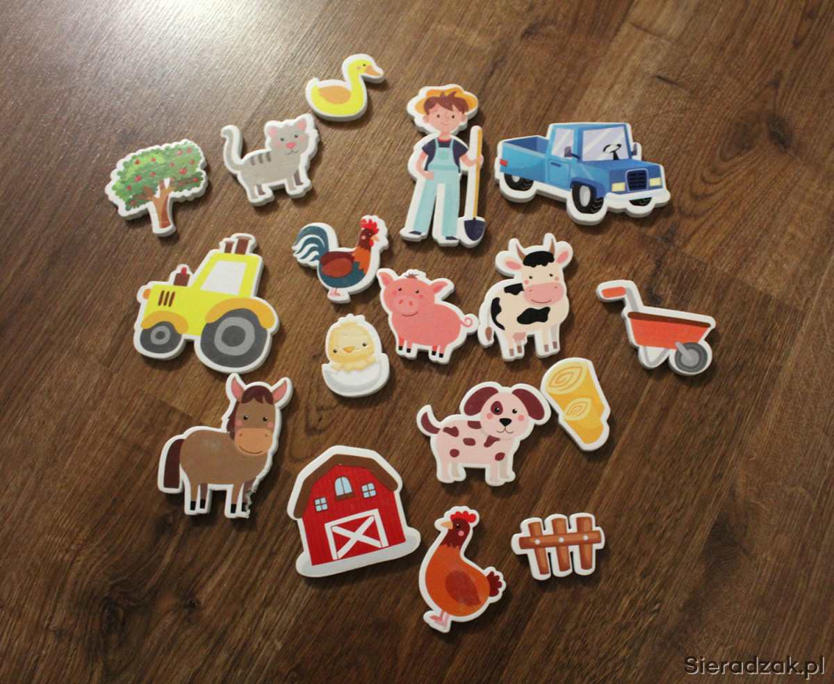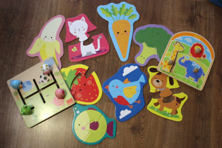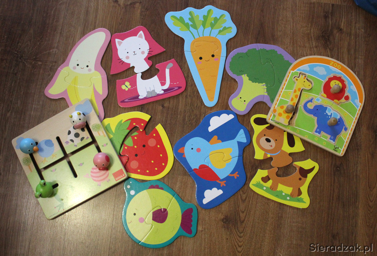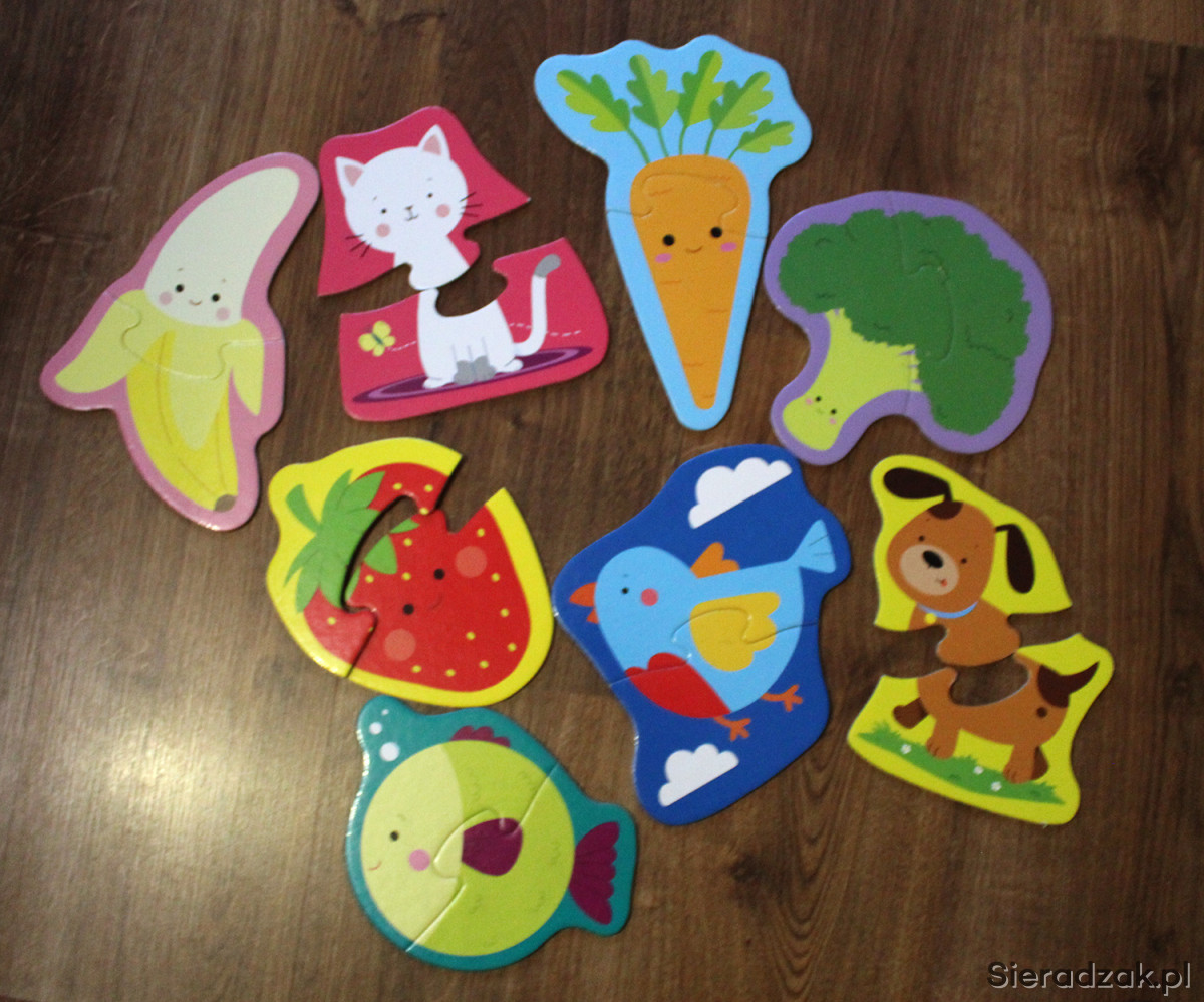 3) Duże puzzle z grubego kartonu z motywem zwierząt, owoców i warzyw (łącznie 8 sztuk, marki TREFFL)